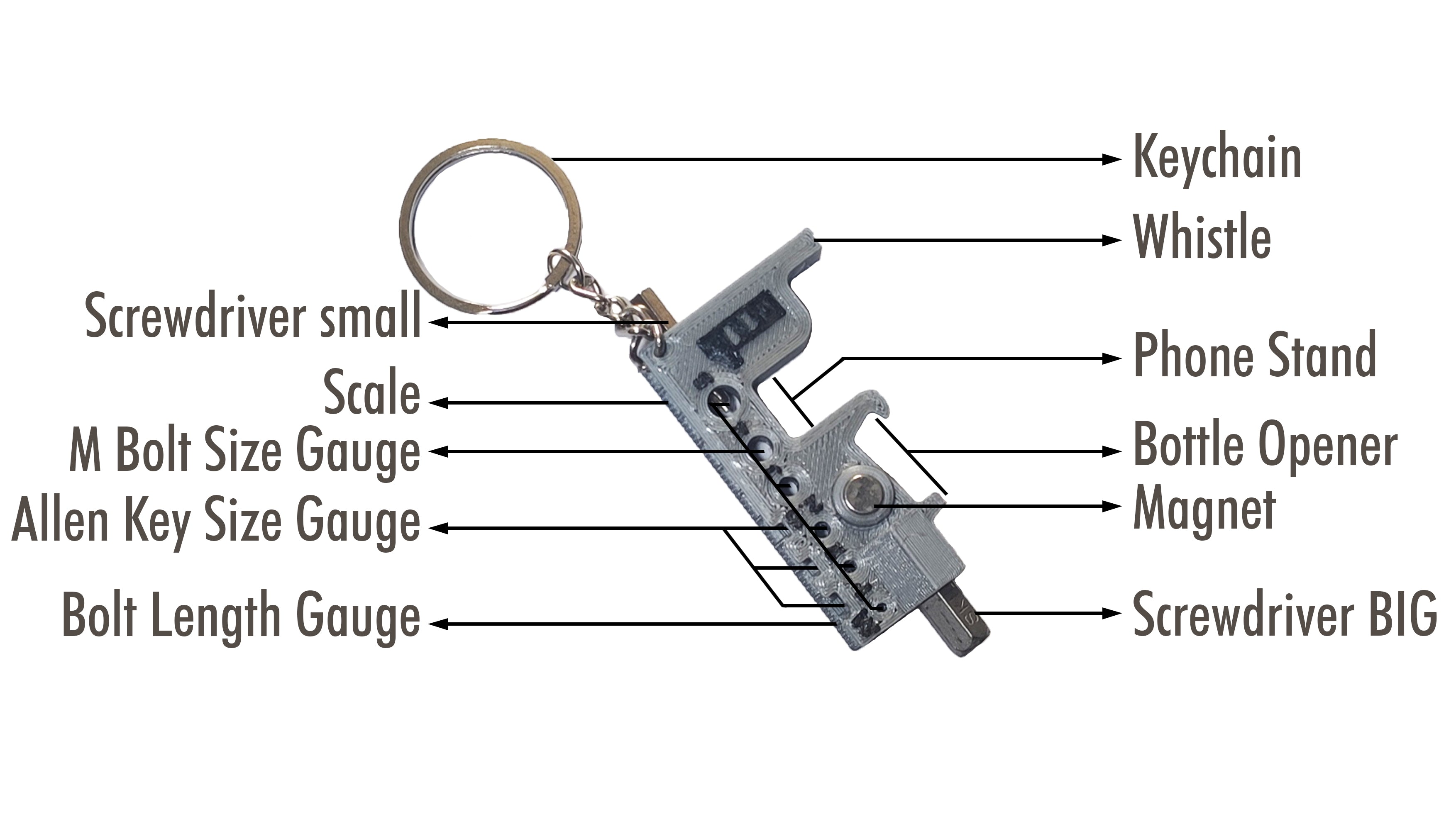 Dies ist ein sehr vielseitiges Werkzeug mit 11 Funktionen, das in Ihre Tasche passt. „11 in 1 – Werkstatt-Multifunktionswerkzeug“ enthält Skala, Schrauben-/Bolzenlängenlehre, M-Serie – Schraubengrößenlehre, Schraubendreher + Bithalter (groß), Schraubendreher + Bithalter (klein), Inbusschlüsselgrößenlehre + Griff, Magnetschale – für verlorene Schrauben etc., Glas-/Bierflaschenöffner, Handyhalter, Pfeife und Schlüsselring!