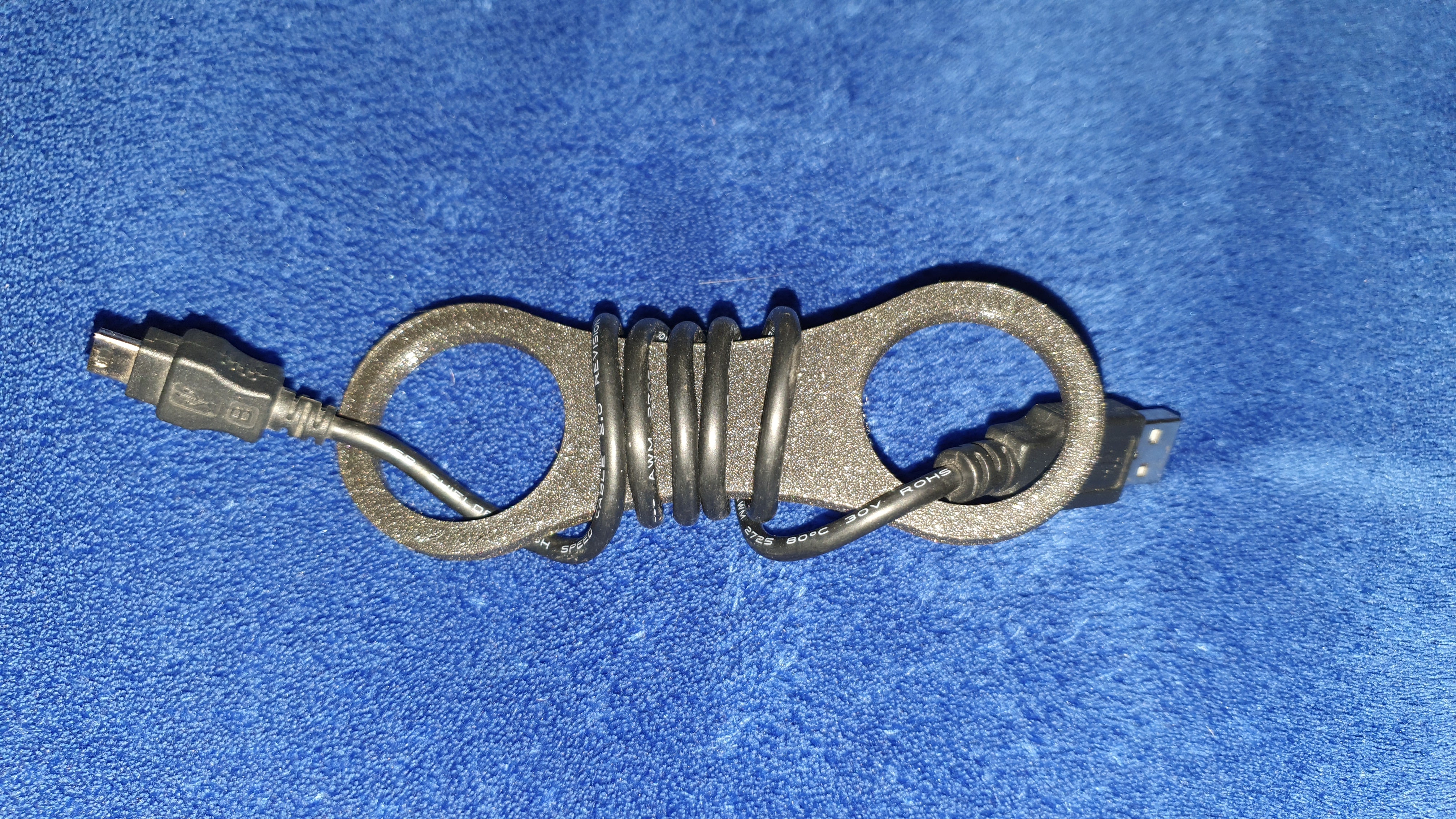 Dabei handelt es sich um einen Kabelhalter, mit dem Sie Ihren Kabelsalat ganz einfach organisieren können. Stecken Sie einfach ein Ende des Kabels in ein Loch, wickeln Sie das Kabel um die Mitte und stecken Sie das andere Ende des Kabels in das andere Loch. Es ist eine einfache und effektive Lösung, um Ordnung in Ihren Kabeln zu schaffen.