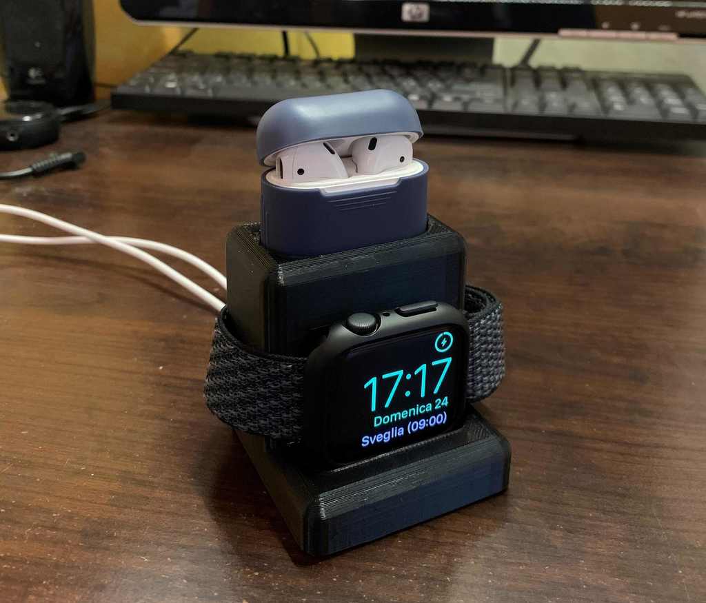 Diese Ladestation vereinfacht das Laden Ihrer Apple Watch SE/6 und AirPods 1/2. Sie schafft einen dedizierten und übersichtlichen Platz auf Ihrem Schreibtisch oder Nachttisch, an dem beide Geräte gleichzeitig geladen werden können.