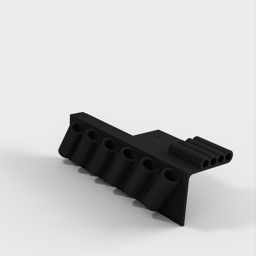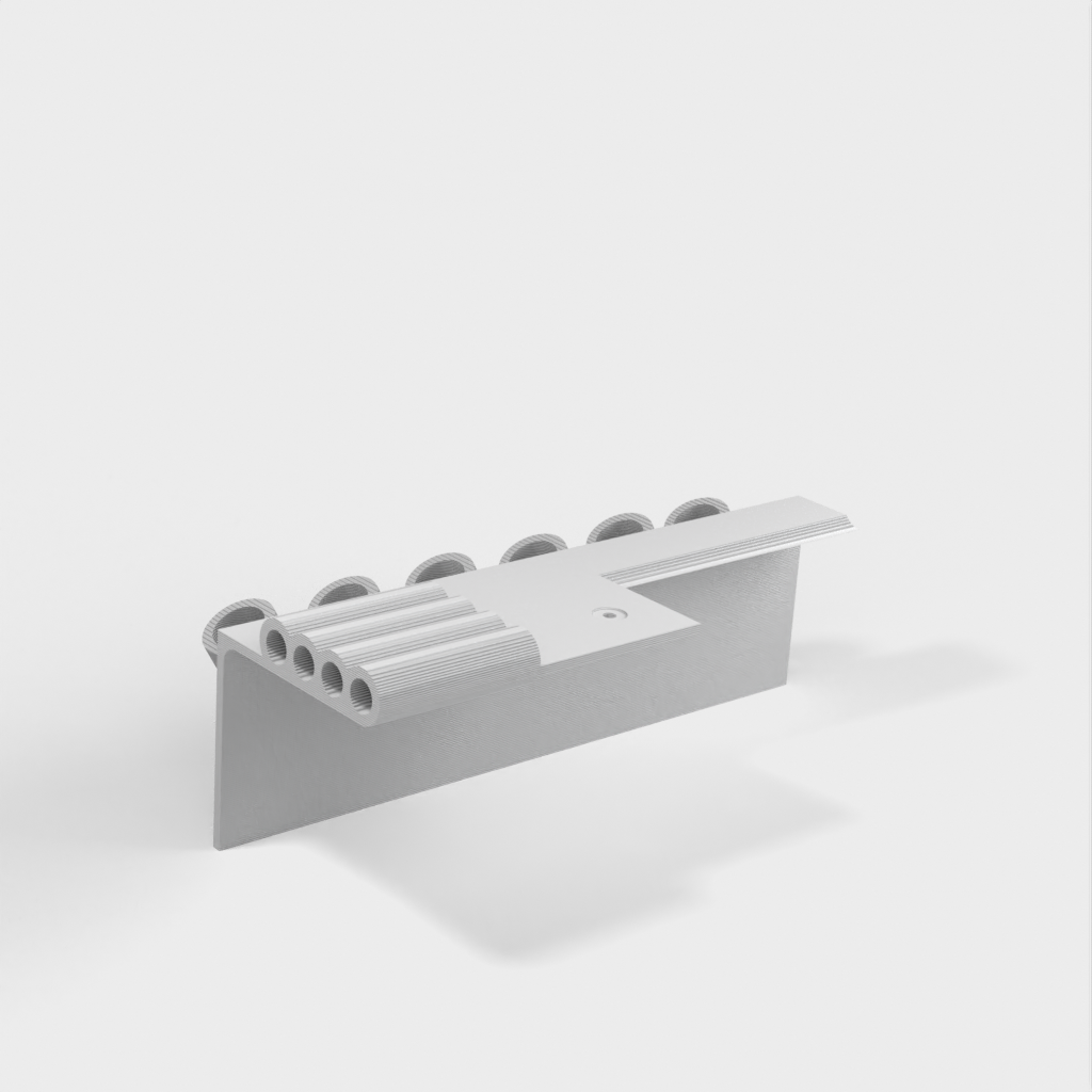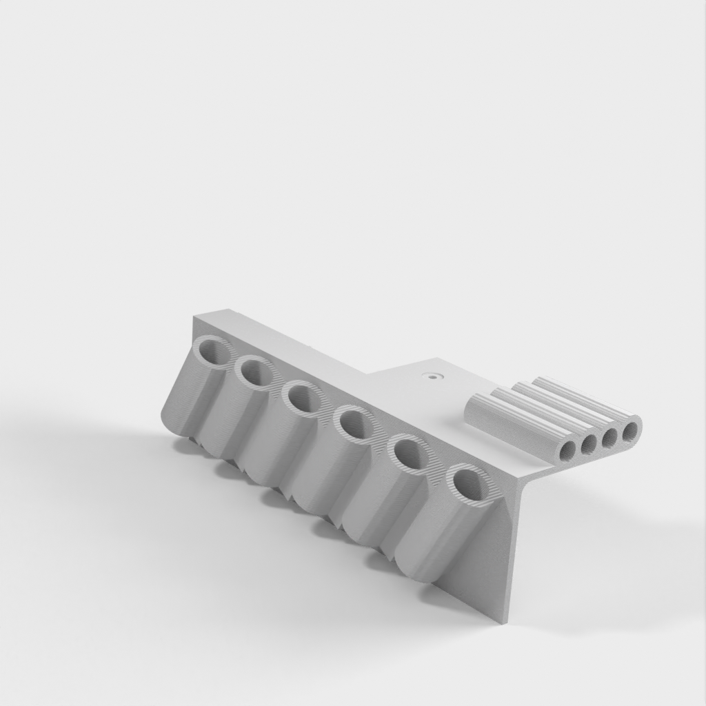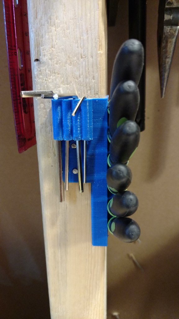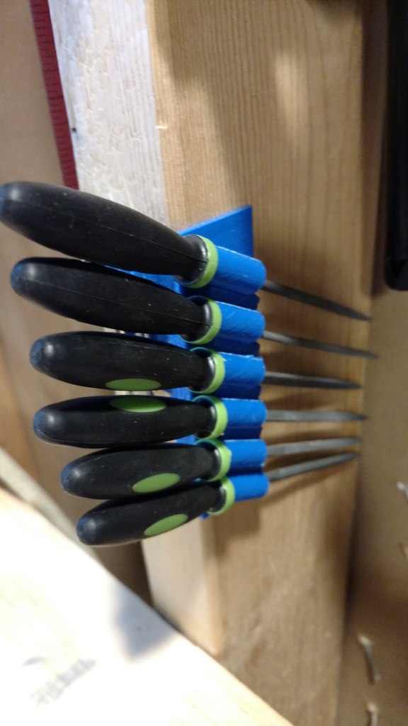 Werkzeughalter mit Bolzenmontage für 6-teilige Nadelfeilen (z. B. diese: http://a.co/iLnJ8kb ) oder ähnliche Werkzeuge sowie 4 Inbus-/Inbusschlüssel/Schraubenschlüssel, wie sie beispielsweise mit dem Anet A8 3D-Drucker geliefert werden . Sechs Schlitze sind abgewinkelt und beabstandet, um eine Kollision der Werkzeuggriffe zu verhindern. Zwei versenkte Nagellöcher zur Montage an einem Wandpfosten.