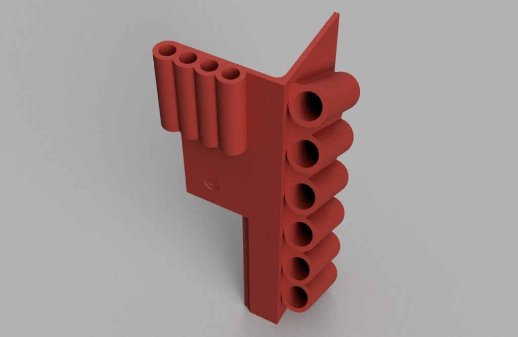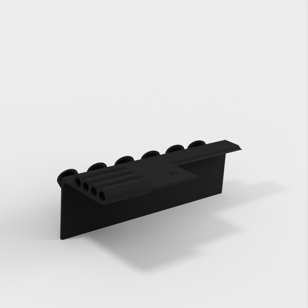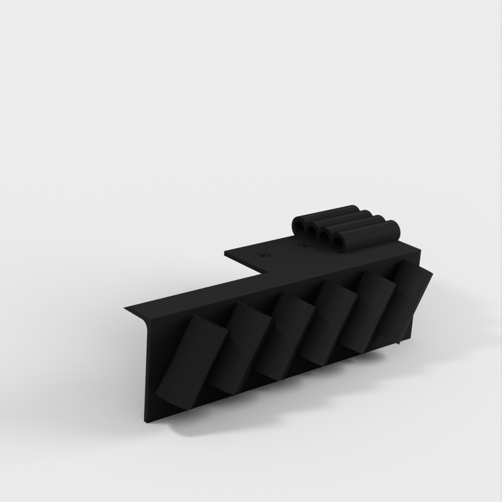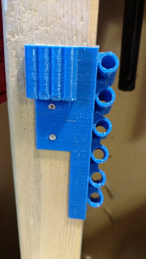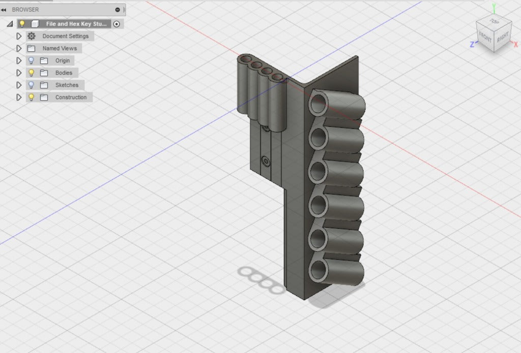 Werkzeughalter mit Bolzenmontage für 6-teilige Nadelfeilen (z. B. diese: http://a.co/iLnJ8kb ) oder ähnliche Werkzeuge sowie 4 Inbus-/Inbusschlüssel/Schraubenschlüssel, wie sie beispielsweise mit dem Anet A8 3D-Drucker geliefert werden . Sechs Schlitze sind abgewinkelt und beabstandet, um eine Kollision der Werkzeuggriffe zu verhindern. Zwei versenkte Nagellöcher zur Montage an einem Wandpfosten.