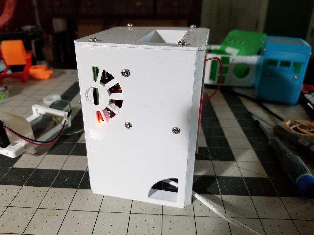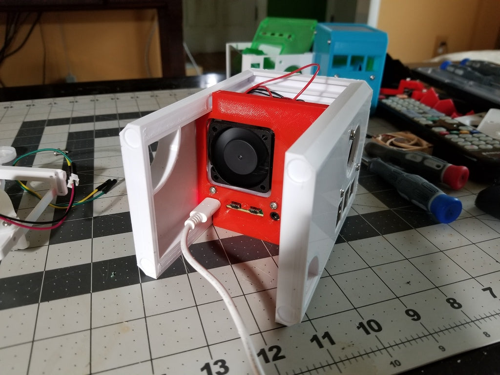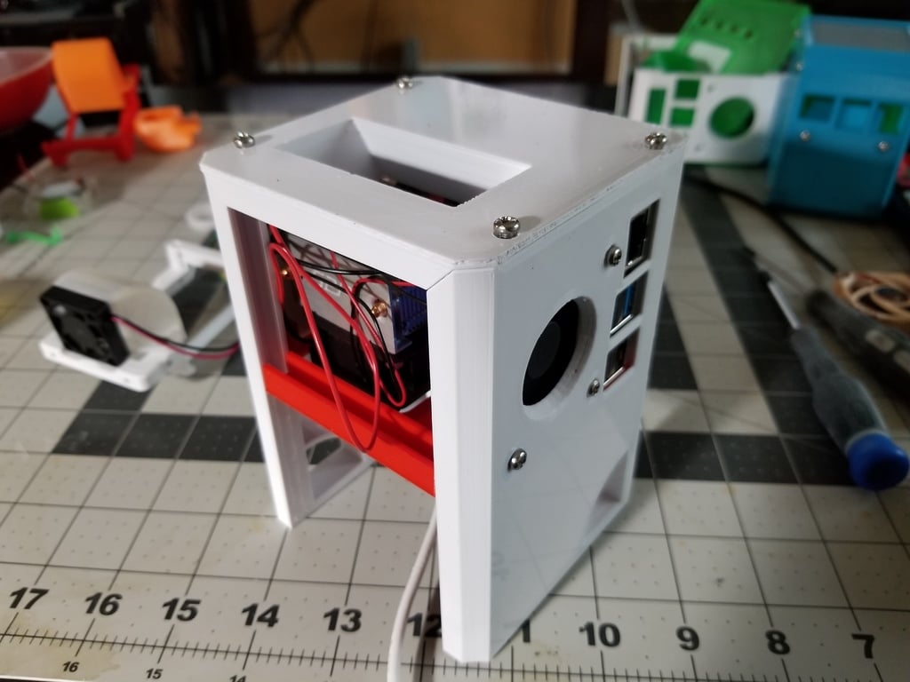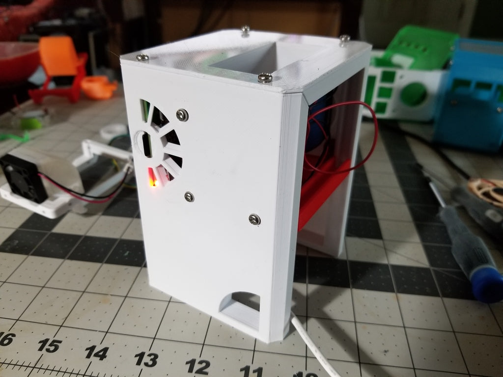 Dies sind Upgrade-Teile, um das vertikale Gehäuse des Raspberry Pi 4 + Ice Tower Cooler zu aktualisieren, um die neue Dual-Lüfter-Konfiguration zu verwenden. Dieser Mod verleiht dem vertikalen Gehäuse die gesamte Kühlleistung des Mini-Desktop-Gehäuses. Der Mod erfordert das Nachdrucken des größten Teils des Schranks. Die SD-Seite erhält einen Auslassanschluss und die USB-Seite einen Ansaugtrichter. Es gibt optional eine alternative Unterseite, die einen 40x20-mm-Lüfter auf dem Kühlkörper aufnehmen kann, sowie eine alternative Oberseite, die den Kanal aus der Originalversion entfernt und die Auslassöffnung durch ein Gitter ersetzt. Dadurch wird Platz rund um die GPIO-Pins frei und der Anschluss weiterer Lüfter erleichtert.
