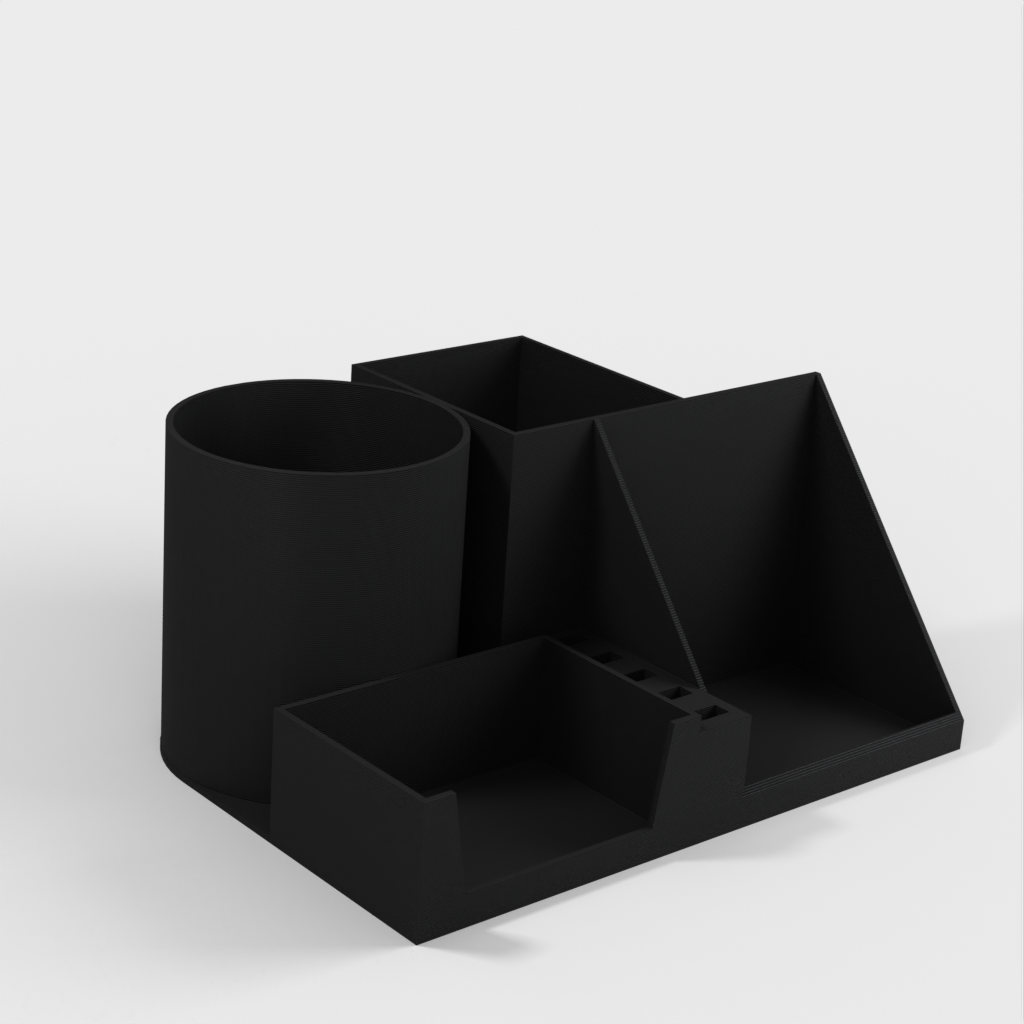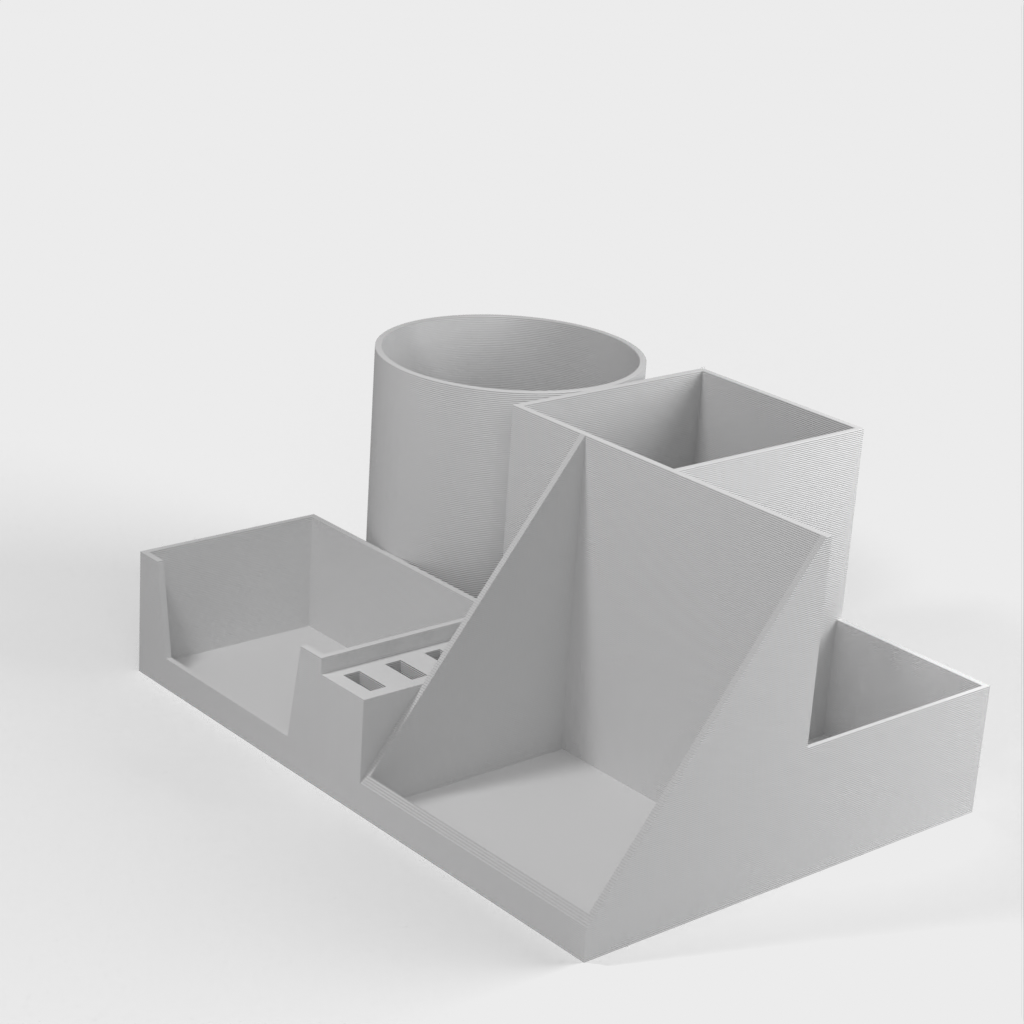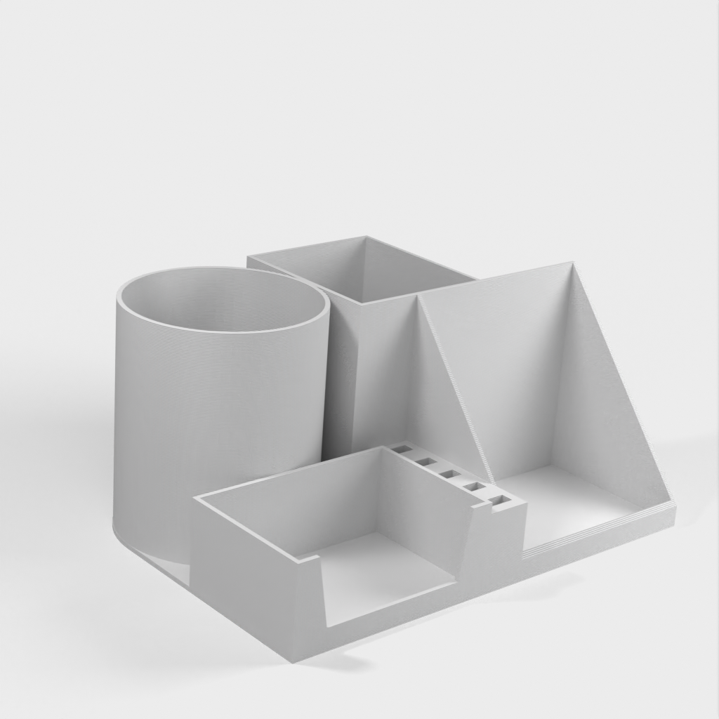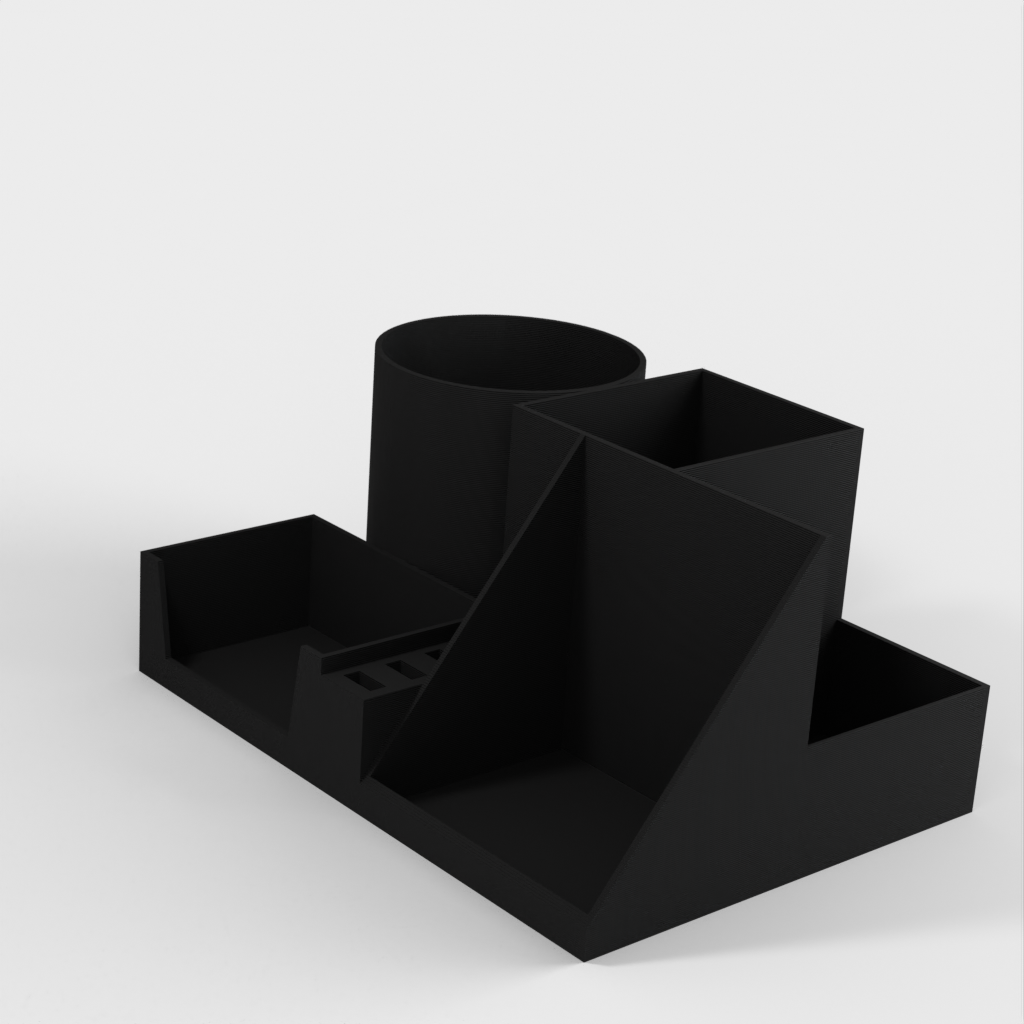 Hierbei handelt es sich um einen 3D-gedruckten Schreibtisch-Organizer, der als funktionelles Werkzeug für die Aufbewahrung eines Mobiltelefons, Stifte, Bleistifte oder Marker, Wartungswerkzeuge, Flash-Laufwerke und Visitenkarten dient. Hält Ihren Schreibtisch organisiert und aufgeräumt.