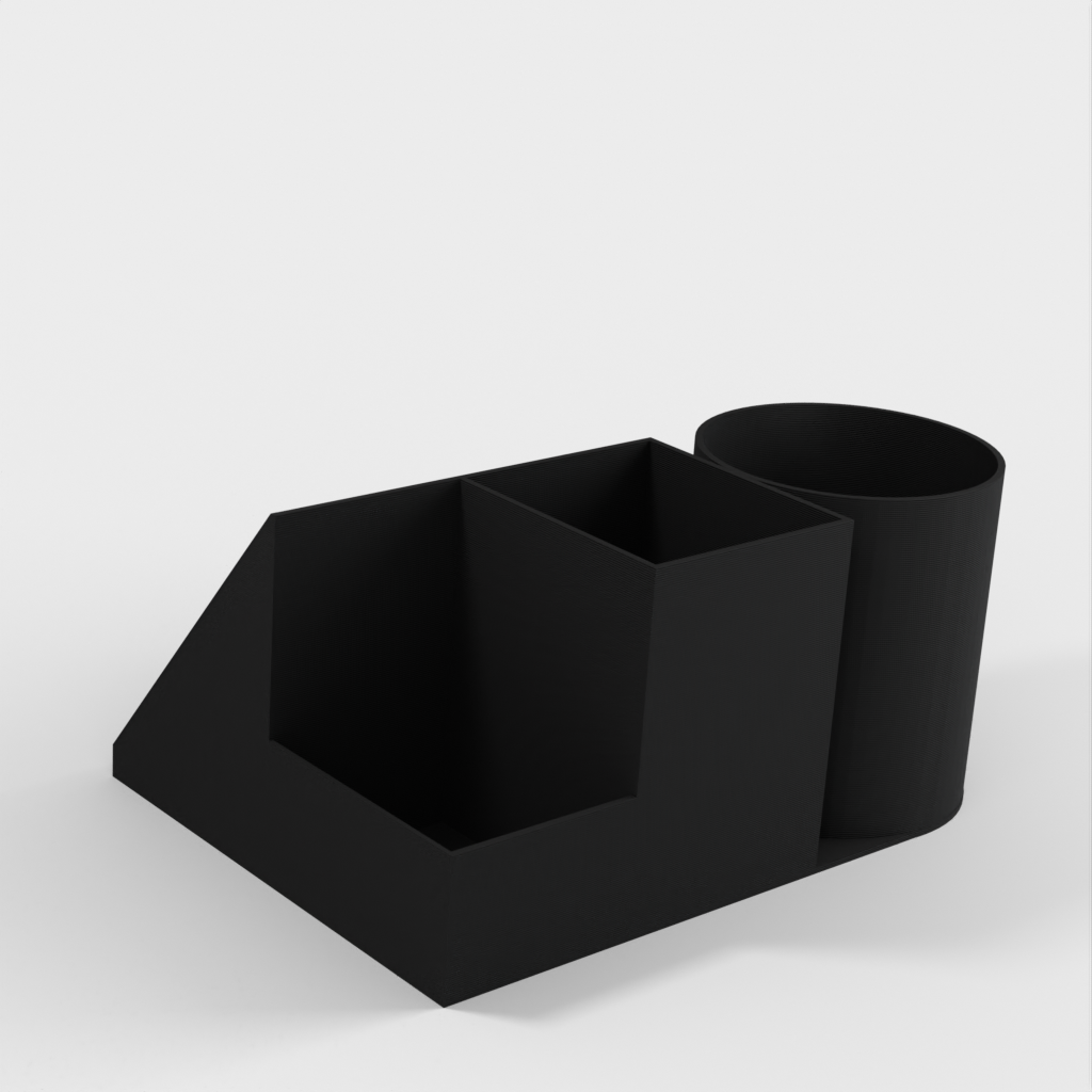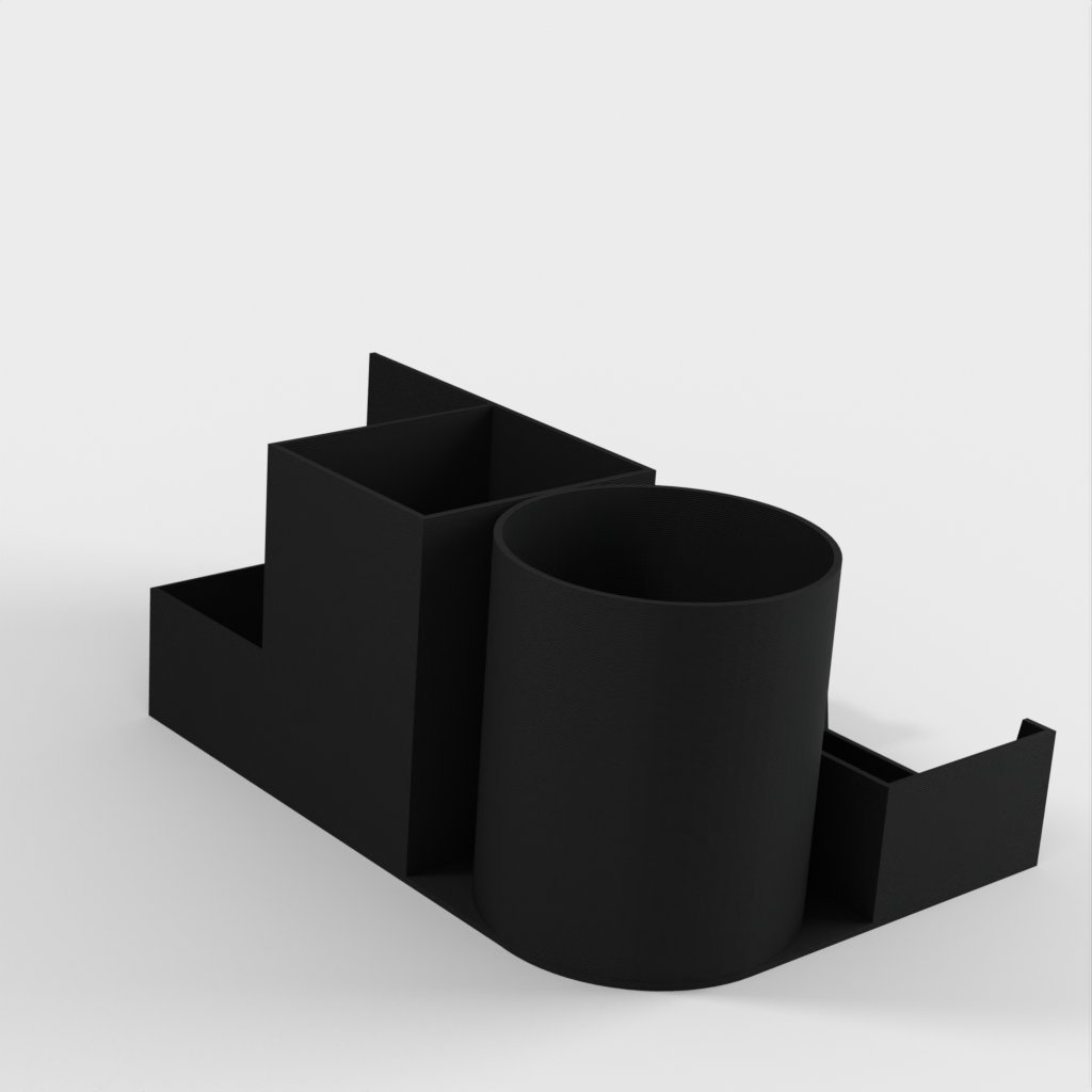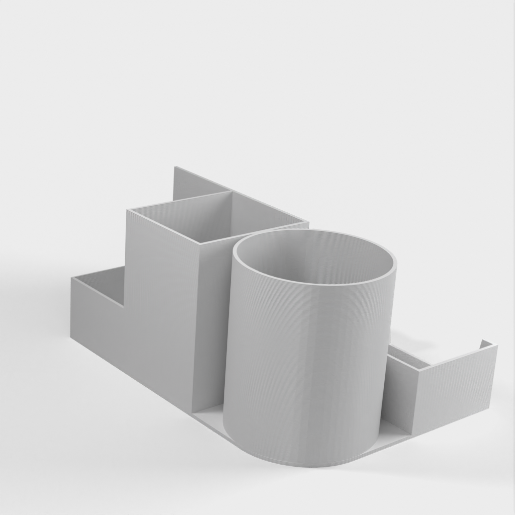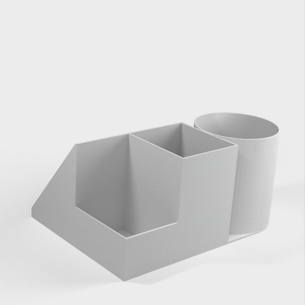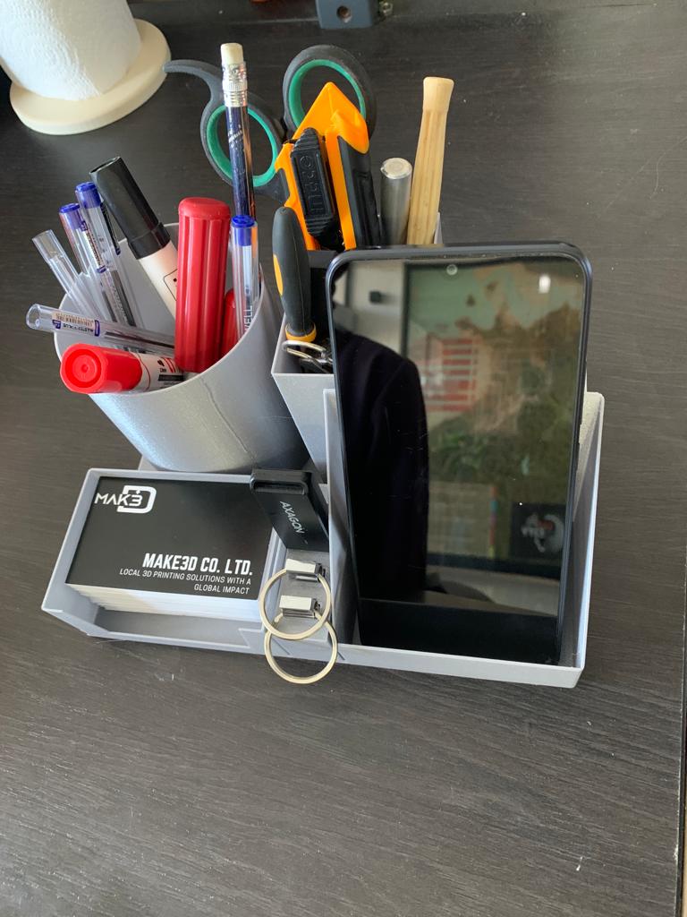 Hierbei handelt es sich um einen 3D-gedruckten Schreibtisch-Organizer, der als funktionelles Werkzeug für die Aufbewahrung eines Mobiltelefons, Stifte, Bleistifte oder Marker, Wartungswerkzeuge, Flash-Laufwerke und Visitenkarten dient. Hält Ihren Schreibtisch organisiert und aufgeräumt.