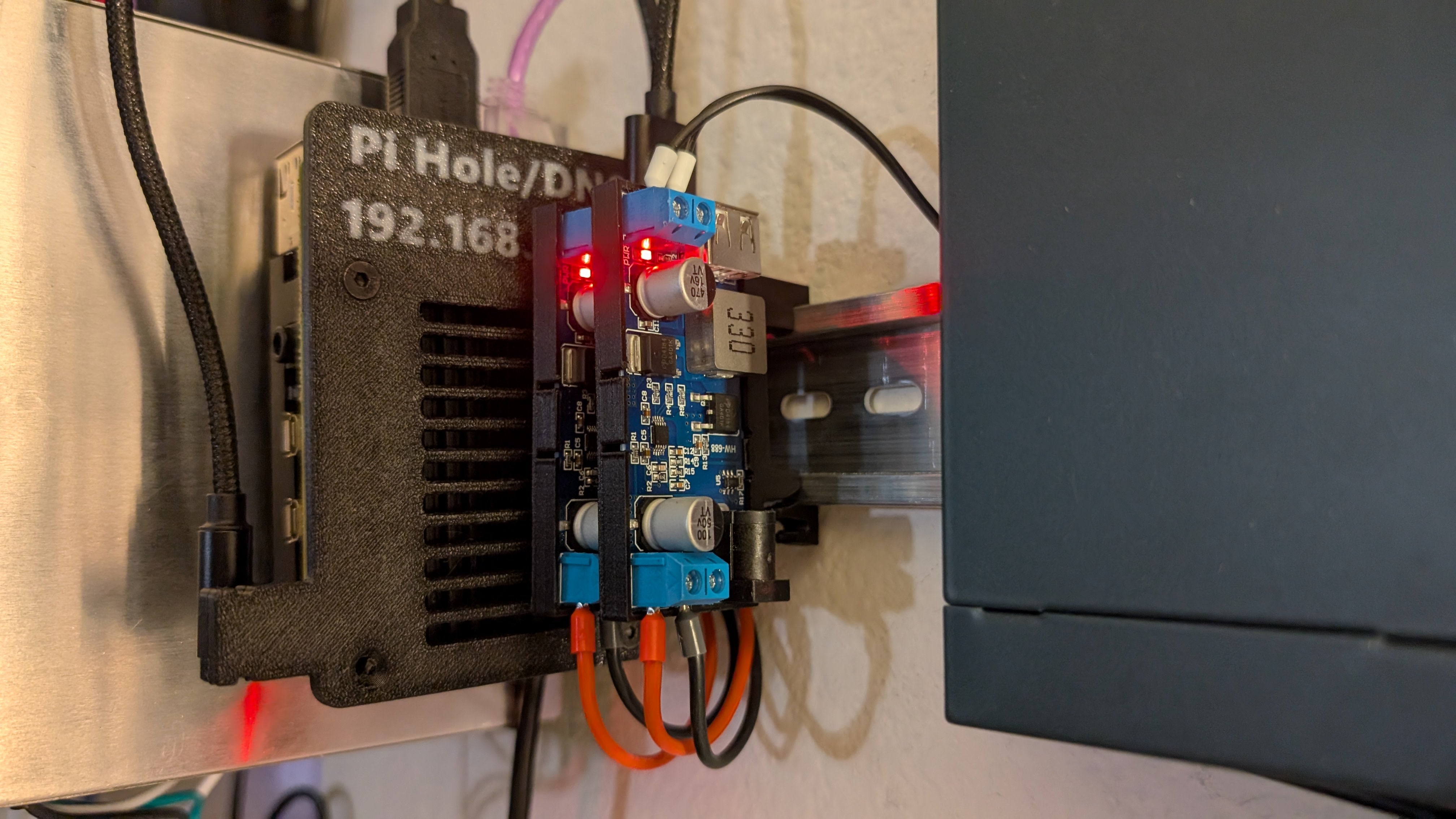 Das Design ermöglicht ein einfaches Einrasten des Abwärtswandlers und ermöglicht so eine unkomplizierte Installation. Dieser Wandleraufbau eignet sich besonders für die Versorgung empfindlicher 5-V-Geräte, wie z. B. Raspberry Pi-Boards, direkt von einer höheren Spannungsquelle, z. B. einem 24-V-Netzteil, und wandelt die Spannung effizient in die benötigte 5-V-Ausgangsspannung um.