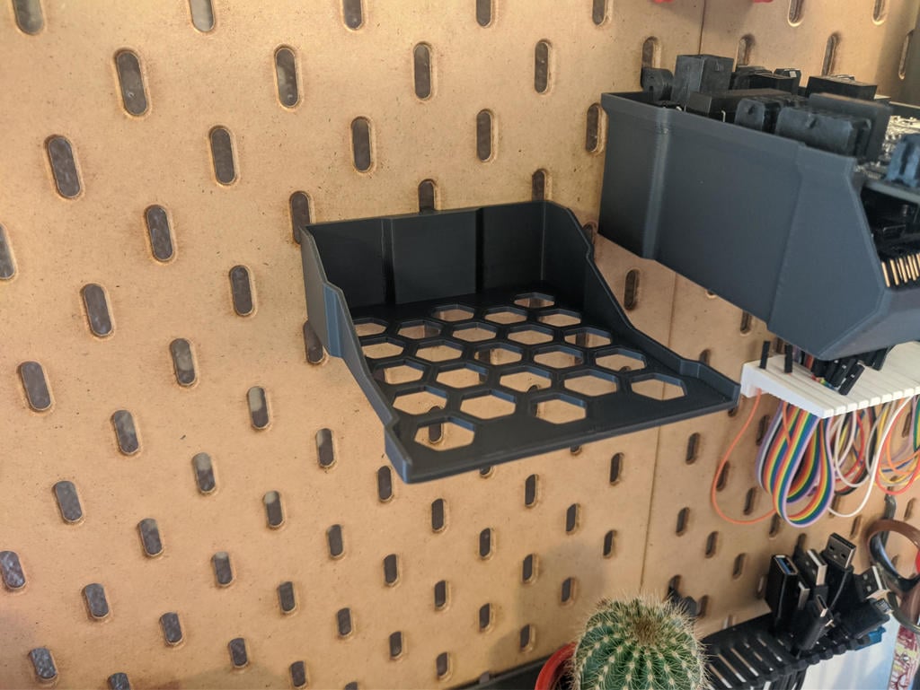 Das Regal für das IKEA SKÅDIS-Kunststoffbrett ist so konzipiert, dass es eine bestimmte Box aufnehmen und gleichzeitig stapelbar bleibt. Dieses Regal ist mit dem Stackable Box V4 -System kompatibel, was zu einer besseren Organisation und einfacheren Lagerung beiträgt.