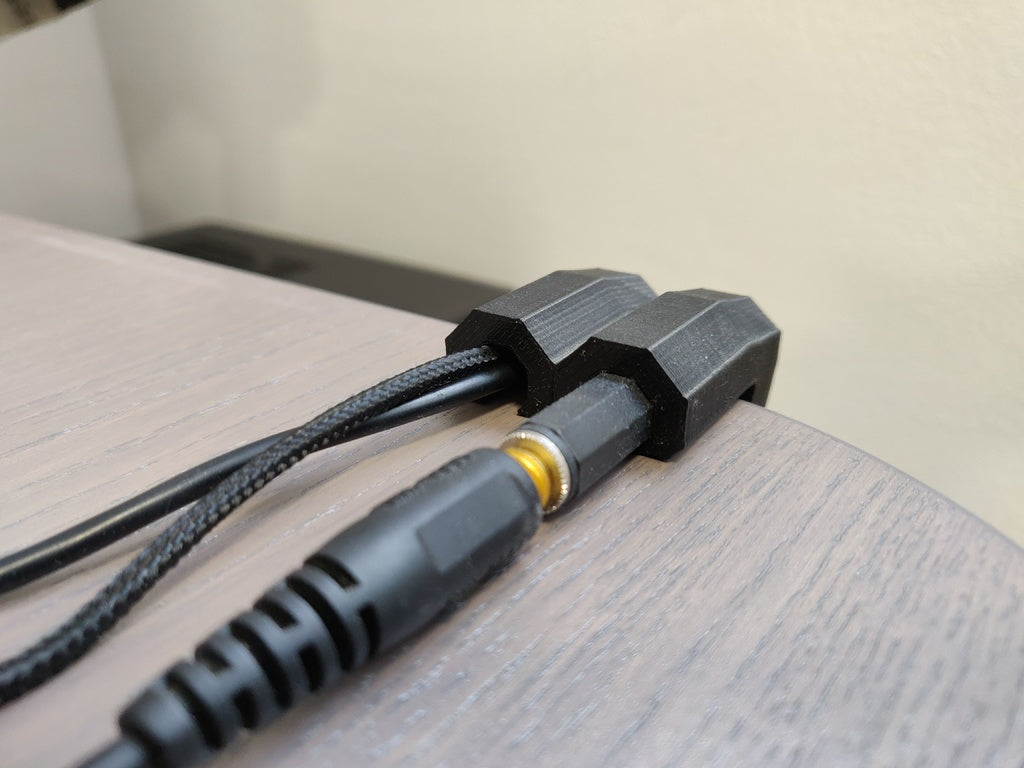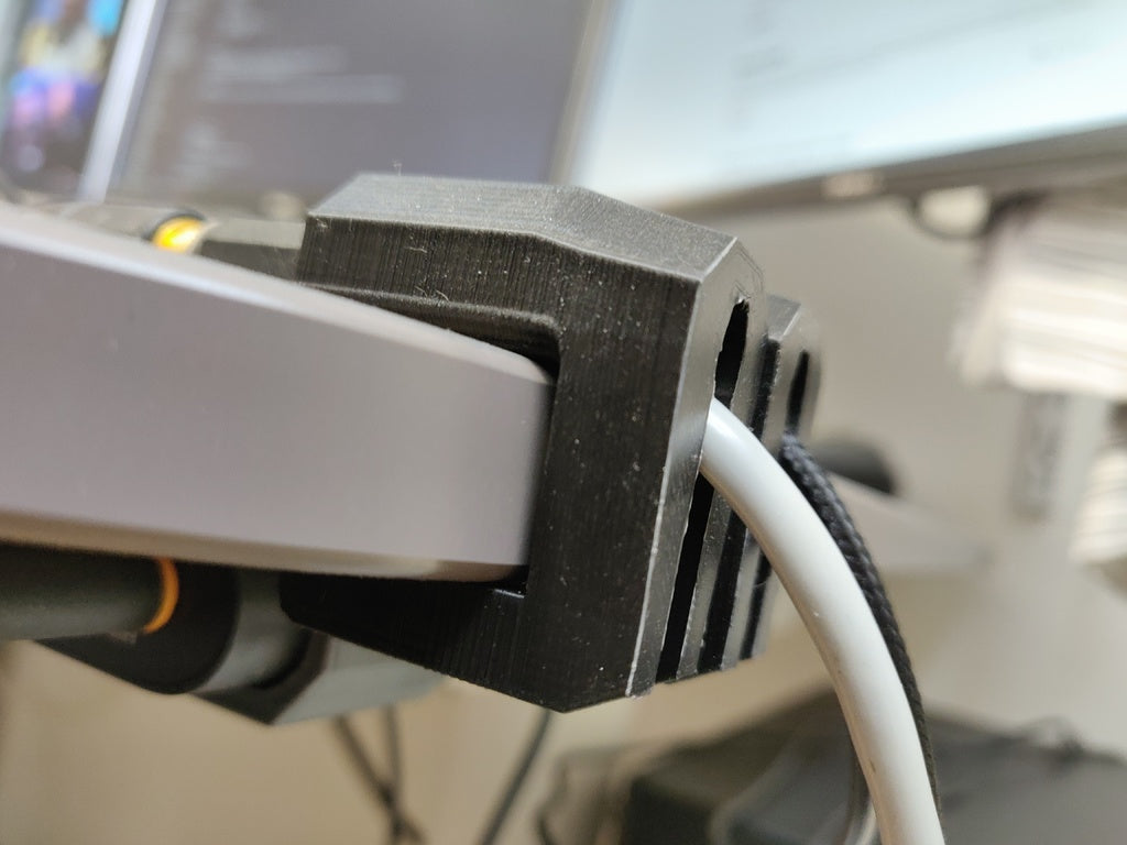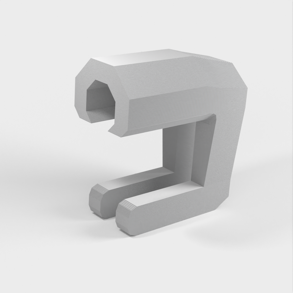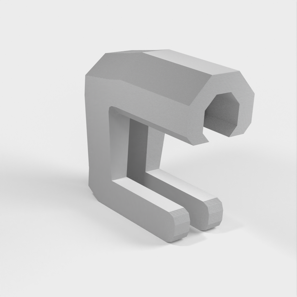 Ein einfacher Kabelhalter, passend zum IKEA BEKANT-Tisch. Mit diesem Halter können Sie die Kabel Ihres Headsets, Ihrer Maus und Ihrer Tastatur verwalten und sie sicher und organisiert aufbewahren. Perfekt für jede Wohn- oder Büroumgebung, in der Kabel schmutzig werden oder auf den Boden fallen können. Dieses Produkt ist für Tische mit einer Dicke von 1,6 cm gedacht.