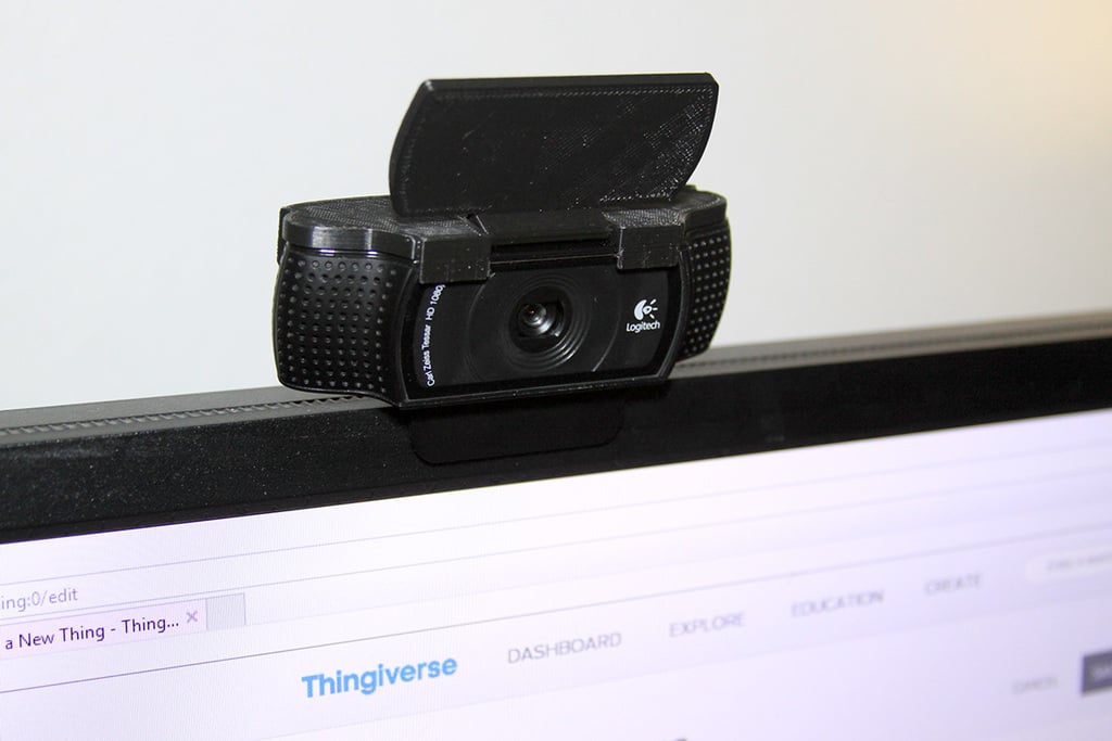 Die Abdeckung besteht aus zwei Teilen: einer oberen Kappe, die auf die Oberseite der Kamera aufschnappt, und der Klappe, die an der Kappe befestigt wird. Beide Teile sind so geformt, dass sie den Konturen der C920-Kamera folgen und so für ein sauberes und integriertes Erscheinungsbild sorgen. Diese Abdeckung ist mit allen Kameras der Logitech 900-Serie kompatibel.