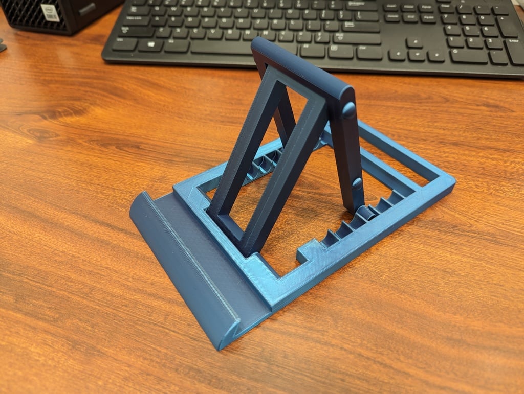 Dieser aktualisierte iPad-Ständer wurde speziell für größere Apple iPads entwickelt, um ein verbessertes Benutzererlebnis zu bieten. Der Ständer ist mit internen Bolzen verstärkt, die sicherstellen, dass er auch im zusammengeklappten Zustand und bei Nichtgebrauch stabil und zusammengebaut bleibt. Die Lücken zwischen den beweglichen Teilen wurden reduziert, wodurch eine robustere und weniger wackelige Konstruktion entsteht, die Ihr Gerät sicher an seinem Platz hält. Alle scharfen Ecken sind für eine bequemere Handhabung und ein ästhetischeres Erscheinungsbild abgerundet, während der vordere abgerundete Teil für ein glatteres Finish eine höhere Auflösung erhalten hat. Mit einer Skalierung von 150 % passt dieser iPad-Ständer perfekt zu größeren Apple -Tablet-Modellen und ist somit eine vielseitige Lösung für Arbeit und Unterhaltung.