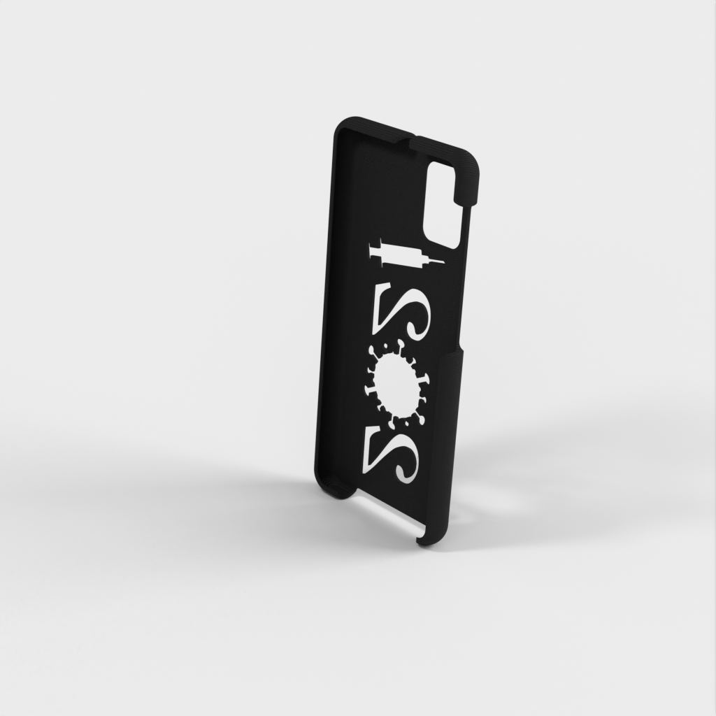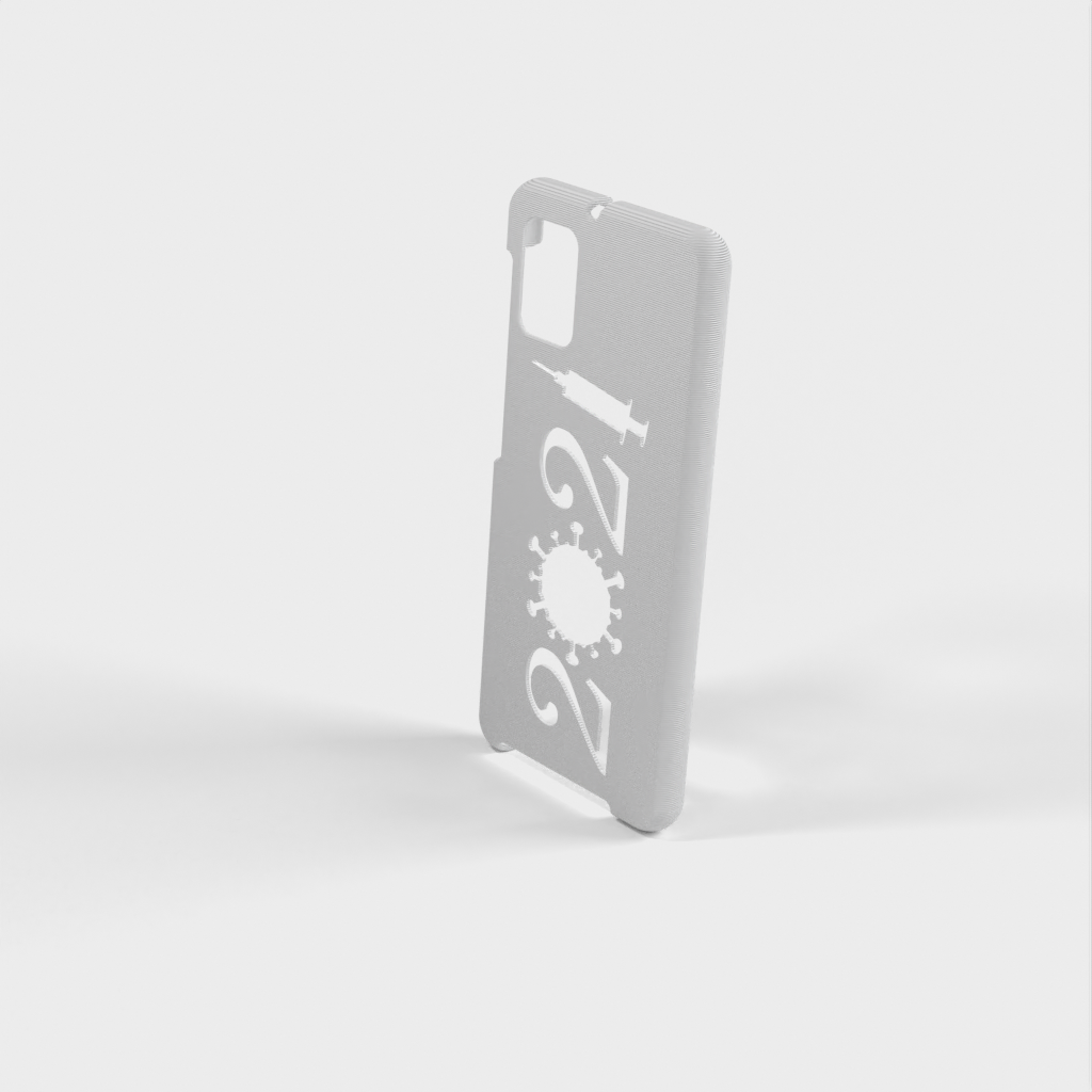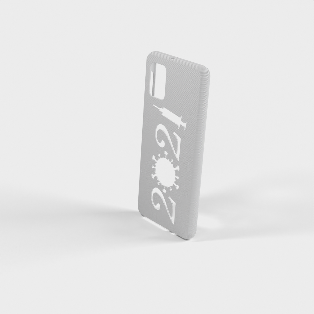 Eine Handyhülle für das Samsung Galaxy A31 a315. Die Hülle ist so konzipiert, dass sie perfekt um das Telefon passt, und es gibt Öffnungen für alle Tasten und Funktionen. Auf der Rückseite des Gehäuses befindet sich ein einzigartiges Design mit der Jahreszahl „2021“ in Form eines Virus und einer Spritze – ein Symbol der Covid-19-Impfung.
