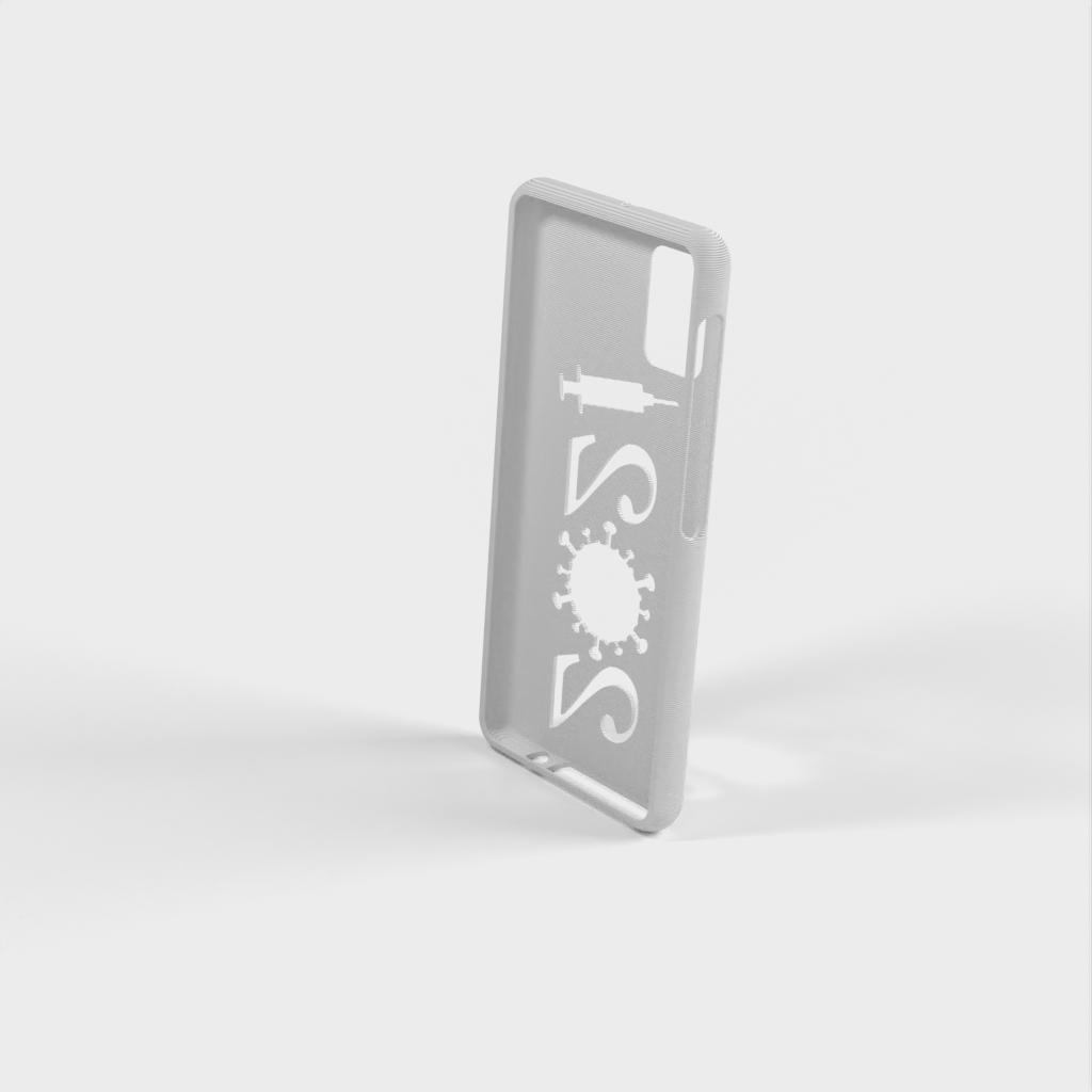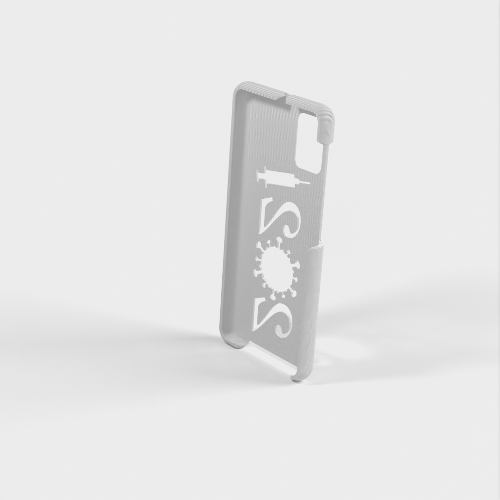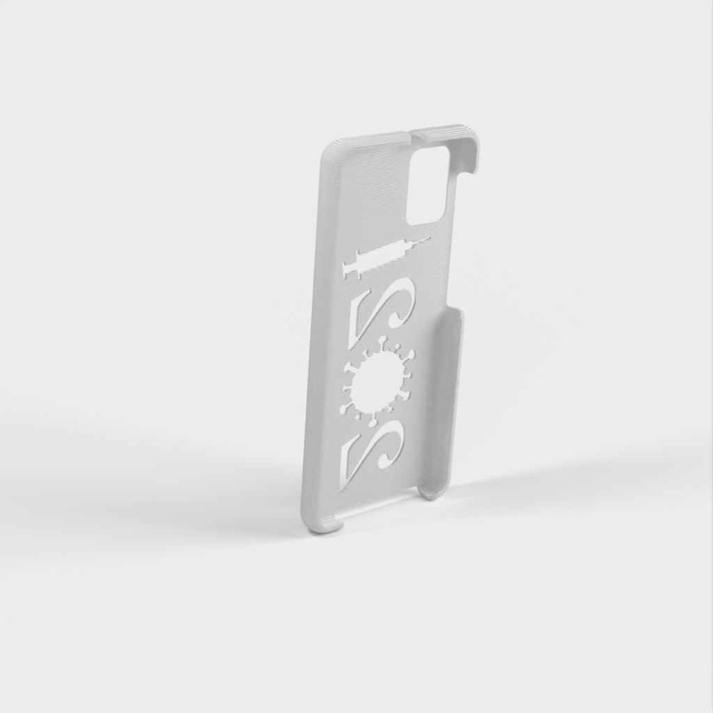 Eine Handyhülle für das Samsung Galaxy A31 a315. Die Hülle ist so konzipiert, dass sie perfekt um das Telefon passt, und es gibt Öffnungen für alle Tasten und Funktionen. Auf der Rückseite des Gehäuses befindet sich ein einzigartiges Design mit der Jahreszahl „2021“ in Form eines Virus und einer Spritze – ein Symbol der Covid-19-Impfung.