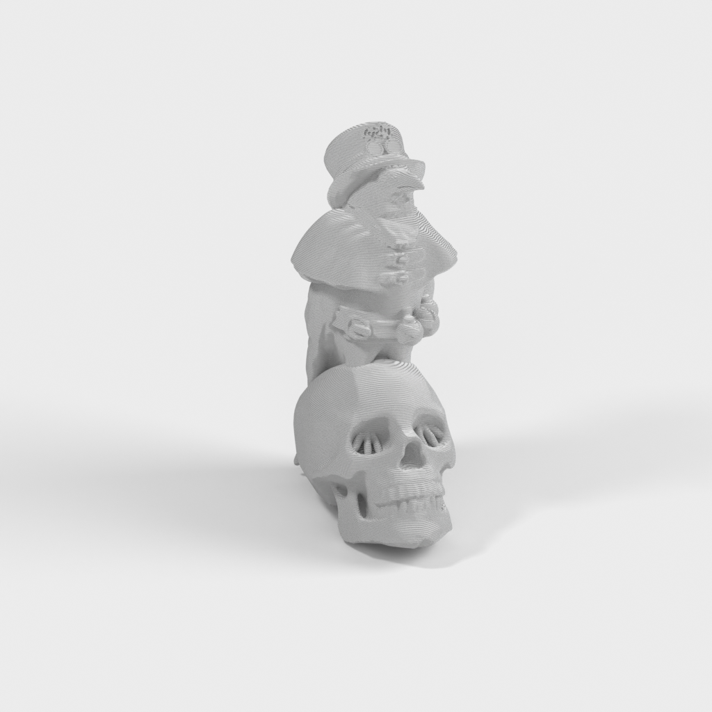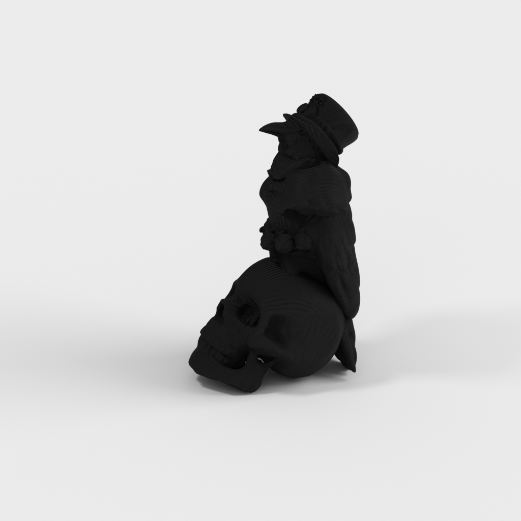 Diese einzigartige Figur zeigt eine imposante Krähe in detailreicher Steampunk-Kleidung. Die Federn des Vogels sind kunstvoll gearbeitet und erinnern an Uhrwerke, während der metallische Zylinder und die Brille ihm einen Hauch industrieller Raffinesse verleihen. Die Krähe sitzt majestätisch auf einem menschlichen Schädel, dessen feine Details den gotischen und geheimnisvollen Look unterstreichen.