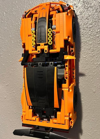 Einfache Wandhalterung für Lego Technic Orange Corvette (#42093). Mit dieser Wandhalterung können Sie Ihr Lego-Modell ganz einfach ordentlich und ansehnlich präsentieren und gleichzeitig Ihre Bausätze organisiert und geschützt aufbewahren.
