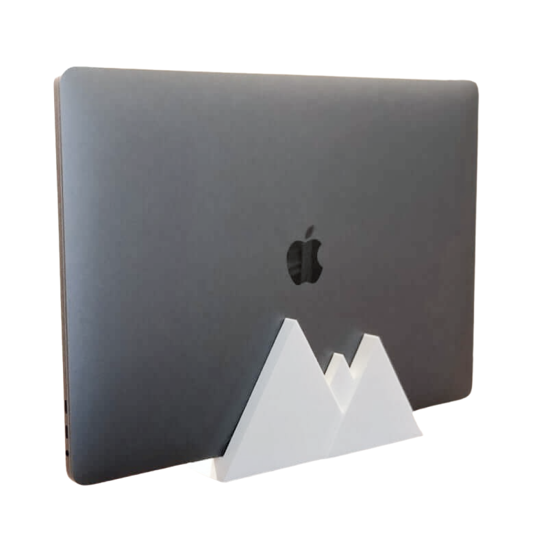 Ein einfacher, aber robuster vertikaler Ständer für ein Macbook Pro mit integrierter Berglandschaft. Das tatsächliche Loch, in dem das MacBook sitzt, ist 1,62 cm breit und passt daher auf die meisten Modelle.