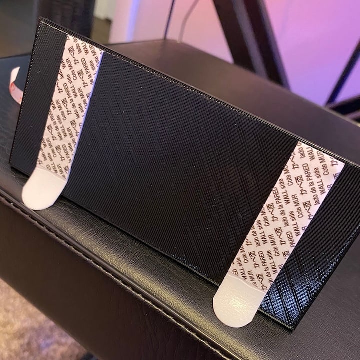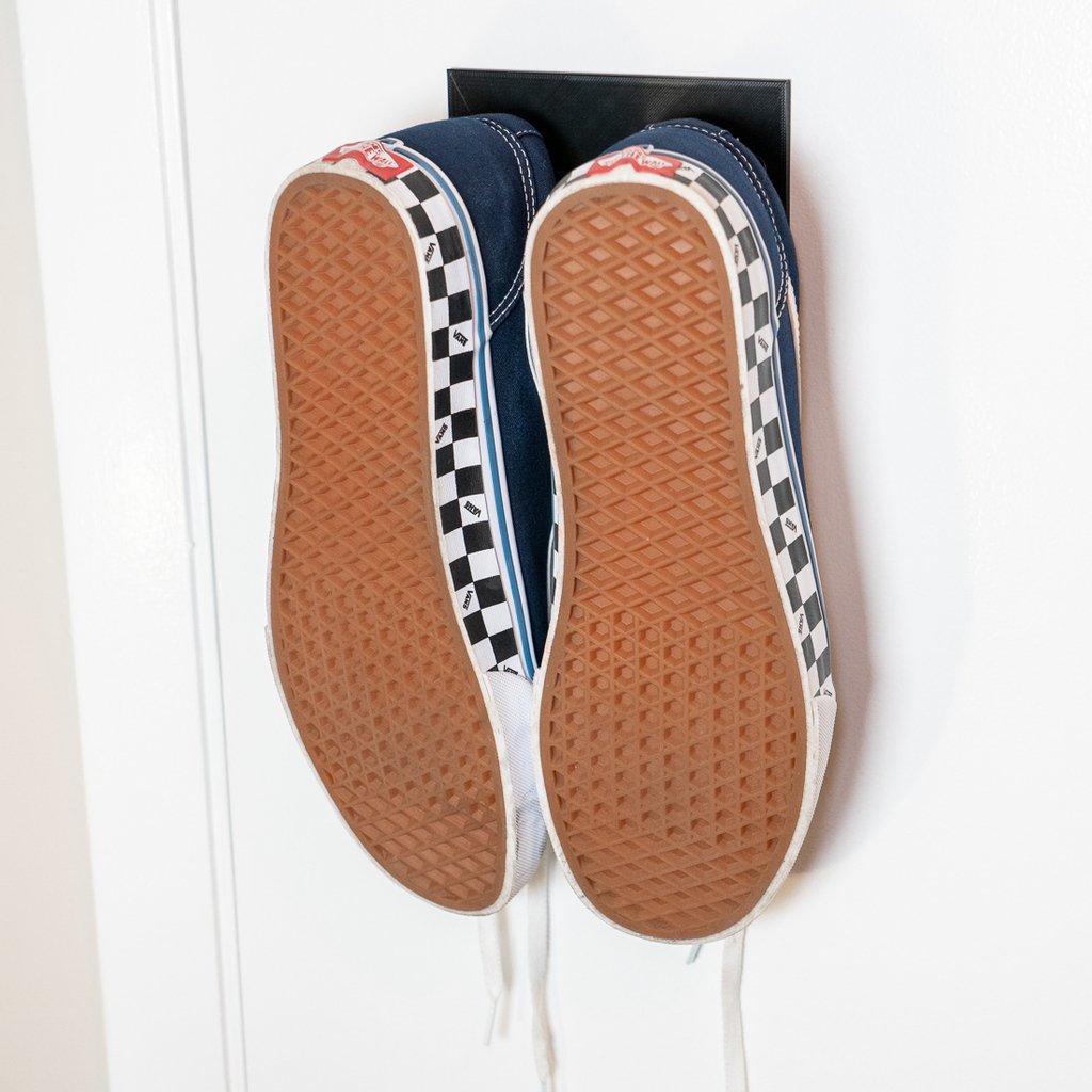 Ein Schuhregal für die Wand. Das Schuhregal kann mit doppelseitigem Klebeband direkt an einer Wand oder Tür befestigt und somit abnehmbar werden. Es ist so gefertigt, dass der Aufhänger an den Klebebändern etwas unterhalb des Schuhregals hängt, sodass diese bei Bedarf entfernt werden können.