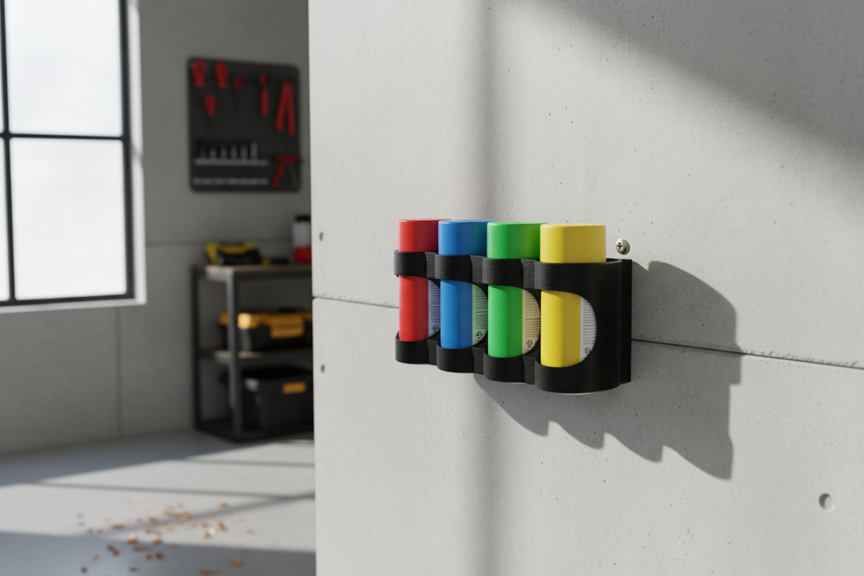 Spraydosenhalter, der 4 Dosen mit einer Breite von bis zu 70 mm aufnehmen kann. Dieser Halter schafft Ordnung in der Werkstatt, im Schuppen oder im Arbeitsfahrzeug.