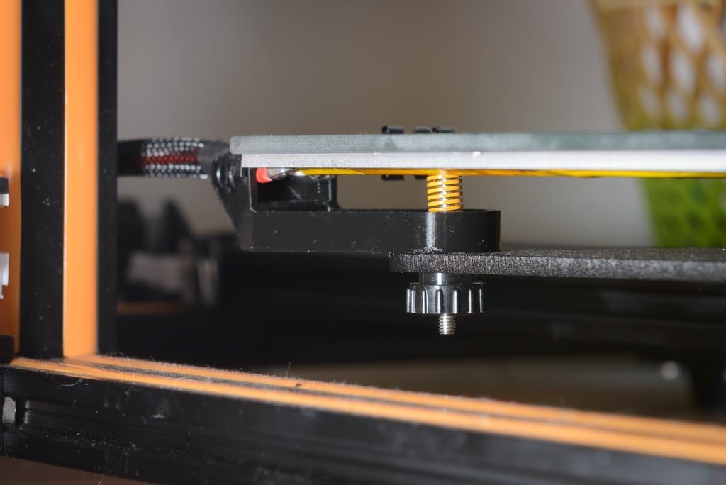 Die Halterung wird normalerweise an der äußersten linken Schraube unter der Feder befestigt. Für optimalen Zugriff kann es erforderlich sein, die Glasplatte von Ihrem Druckbett zu entfernen. Die Konstruktion ist so konzipiert, dass sie nicht mit der heißen Oberfläche in Berührung kommt und somit sicher mit gängigen Druckmaterialien wie PLA verwendet werden kann.