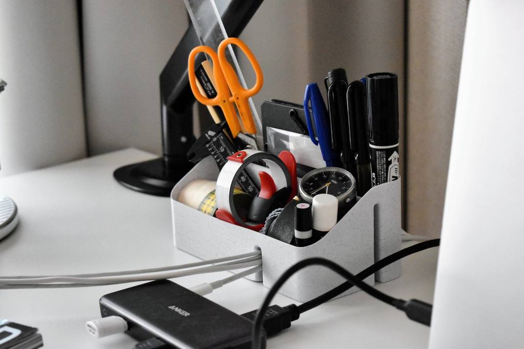 - Sammelt kleine Gegenstände wie Stifte und Büromaterial