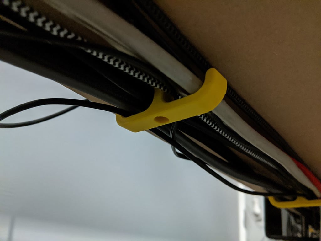 Dieser einfache Kabelhalter dient zur effizienten Organisation von Kabeln unter dem Schreibtisch. Er bietet eine diskrete und praktische Möglichkeit, Kabel zusammenzuhalten, trägt so zu weniger Kabelsalat und einem übersichtlicheren Arbeitsplatz bei. Durch die Befestigung der Kabel unter der Tischplatte sorgt er für ein aufgeräumtes Erscheinungsbild.