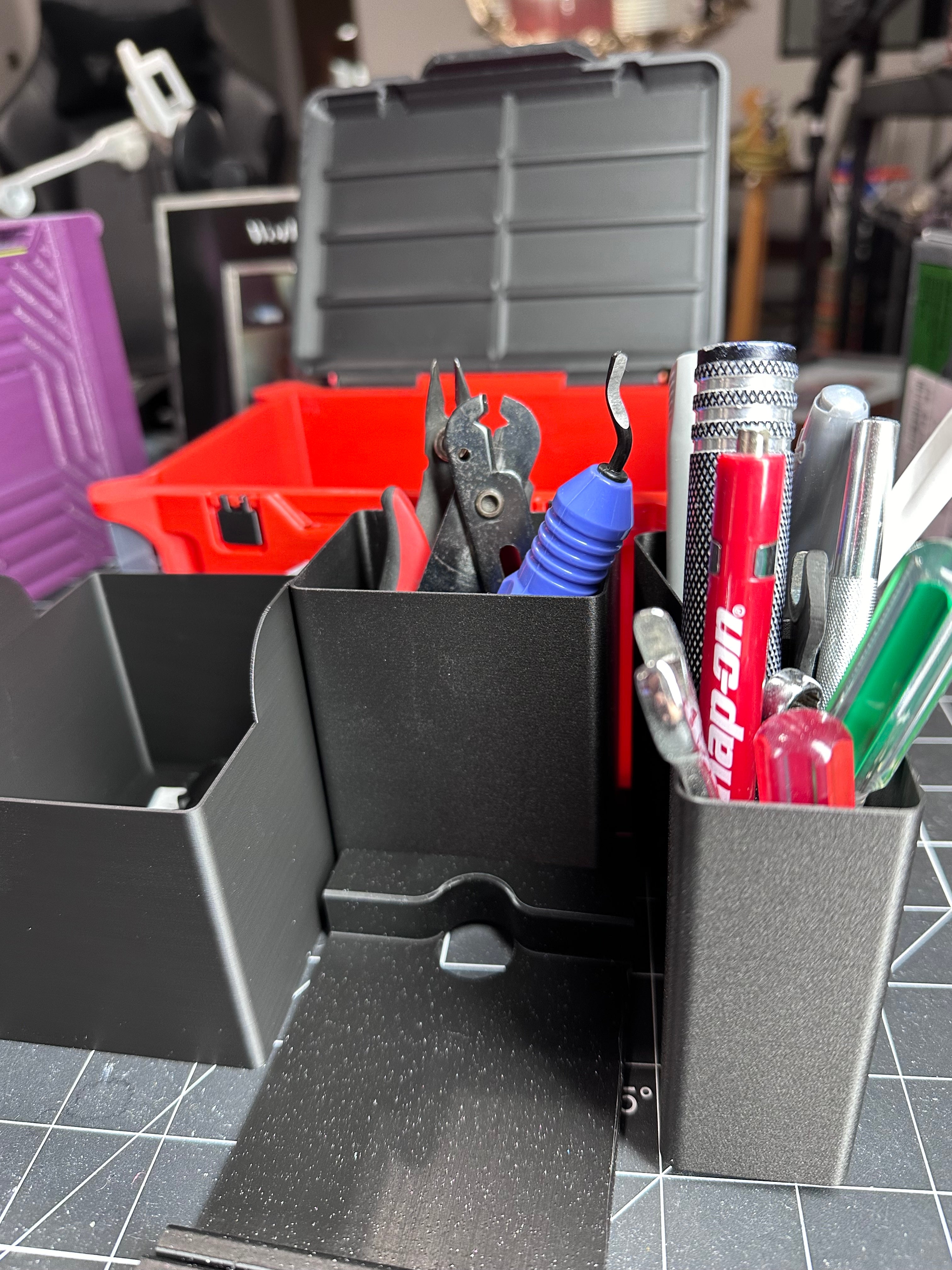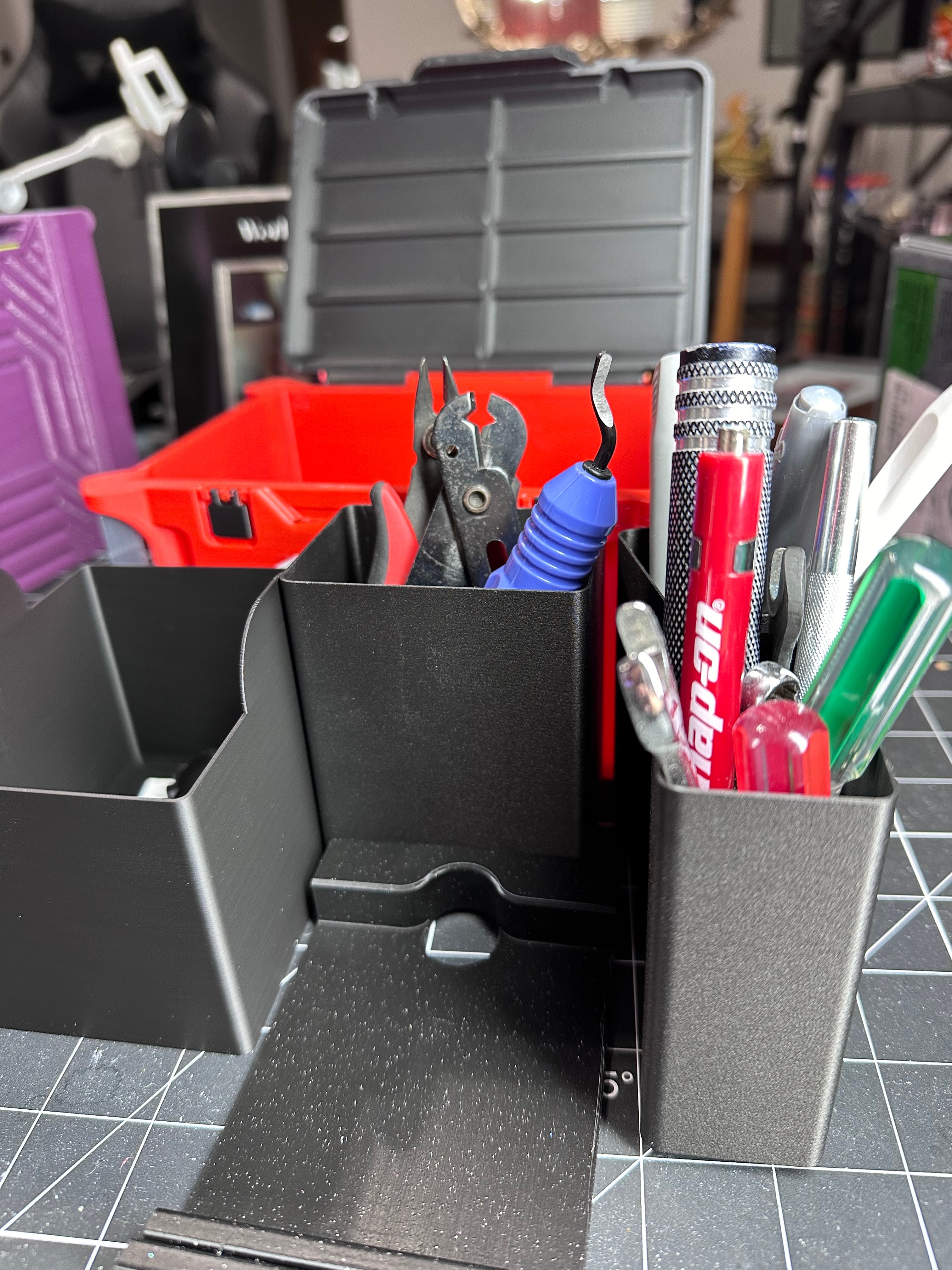 Halten Sie Ihren Arbeitsplatz ordentlich und organisiert mit diesem cleveren, vom Milwaukee Packout inspirierten Schreibtisch-Organizer. Dieser funktionale Organizer ist für die effiziente Aufbewahrung verschiedener Büromaterialien und kleinerer Werkzeuge konzipiert und somit die ideale Wahl für Büro und Hobbyraum. Mit den verschiedenen mitgelieferten Einsätzen können Sie Stifte, Büroklammern, Nadeln und andere kleine Gegenstände einfach sortieren. Eine spezielle Ablage mit Federmechanismus hat die perfekte Größe für einen Standard-Post-it-Block und gibt beim Anheben darunter einen geräumigen Bereich für größere Gegenstände wie Schlüssel oder sogar einen kompakten Akkuschrauber frei. Das macht ihn zu einer guten Option für alle, die eine robuste und vielseitige Organisationslösung suchen. Wählen Sie eine einzelne Farbe oder passen Sie ihn mit mehreren Farben an Ihren Stil an. Dieser Schreibtisch-Organizer ist eine praktische Ergänzung, die hilft, Platz zu maximieren und den Überblick über Ihre wichtigen Dinge zu behalten.