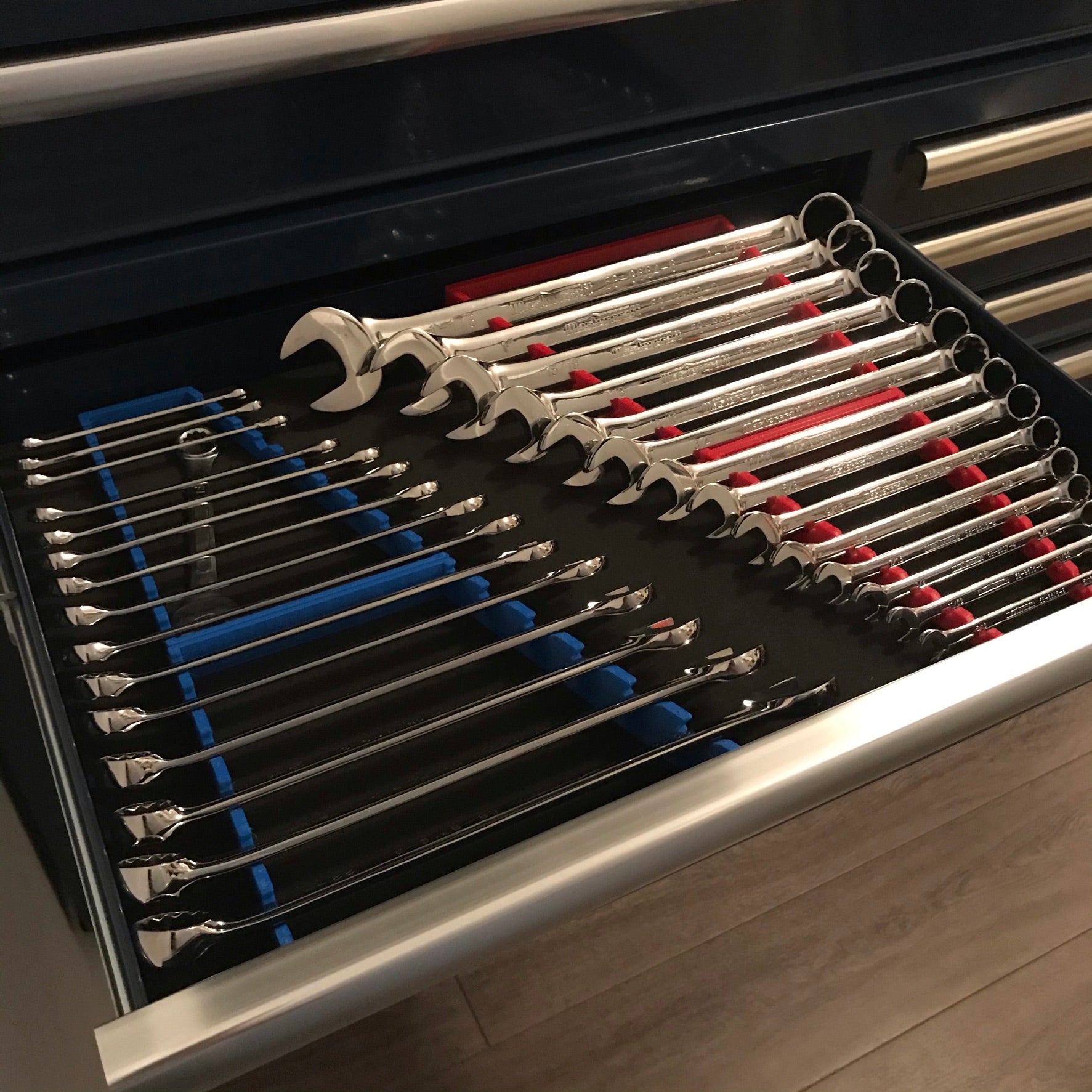 Das Set ist für die meisten Standard-Werkzeugkastenschubladen optimiert und speziell für Schubladen mit einer Breite von 22 Zoll und einer Tiefe von 15 Zoll konzipiert. Das kompakte Design sorgt dafür, dass der Abstand zwischen den einzelnen Schraubenschlüsseln minimiert wird, wodurch die Lagerkapazität maximiert wird, ohne unnötigen Platz zu beanspruchen.