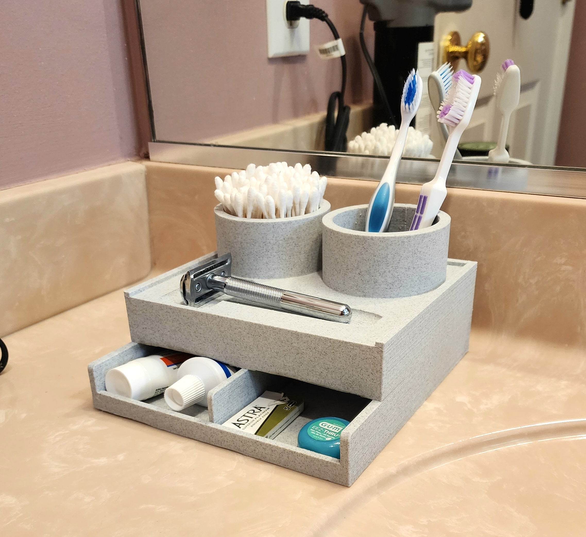 - Integrierte Aufbewahrung für Zahnbürsten, Rasierer und Wattestäbchen