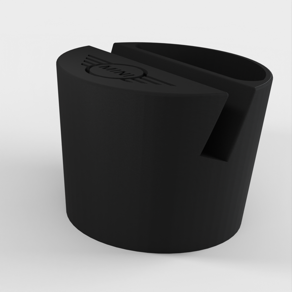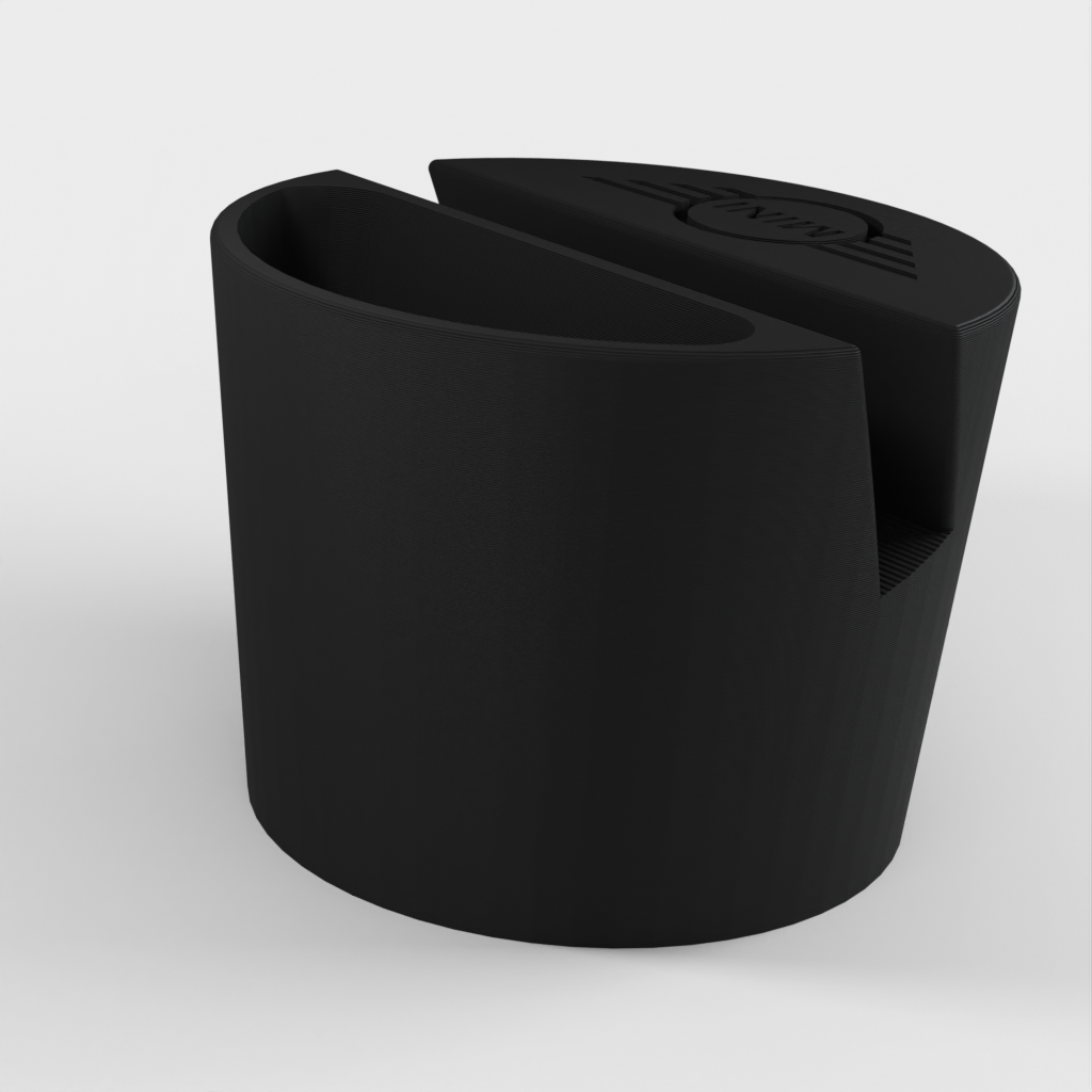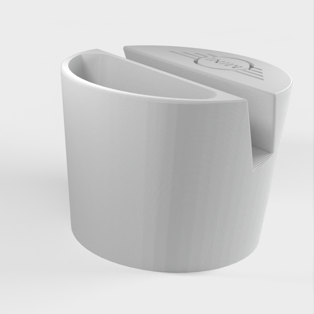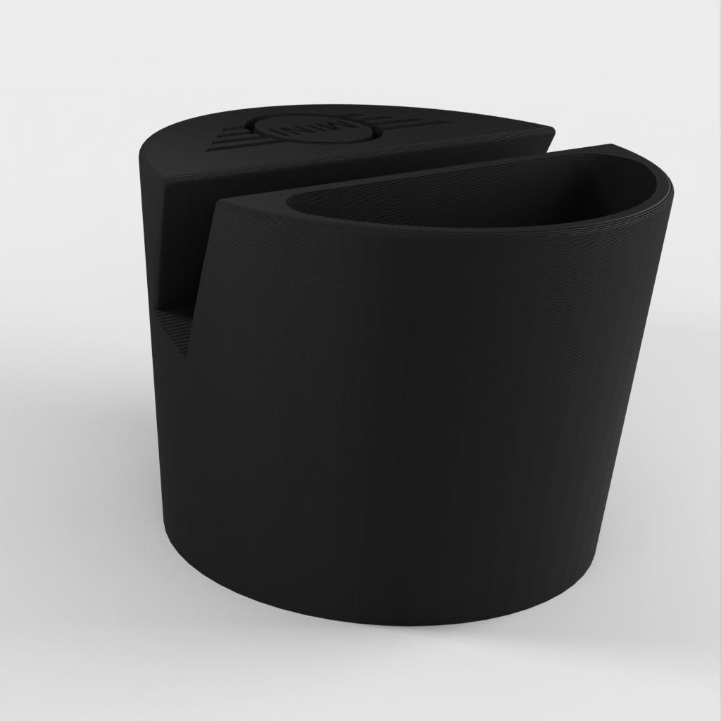Telefonhalter für einen Mini Cooper, der so konzipiert ist, dass er in den Getränkehalter passt. Der Telefonhalter bietet Platz für Telefone mit einer Dicke von bis zu 11 mm und einer Breite von 75 mm. Mit Mini-Logo und einem Loch für kleine Gegenstände wie Fernbedienungen. Hilft dabei, Ordnung in Ihrem Auto zu halten und stellt sicher, dass Ihr Telefon immer in Reichweite ist.