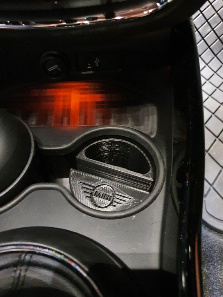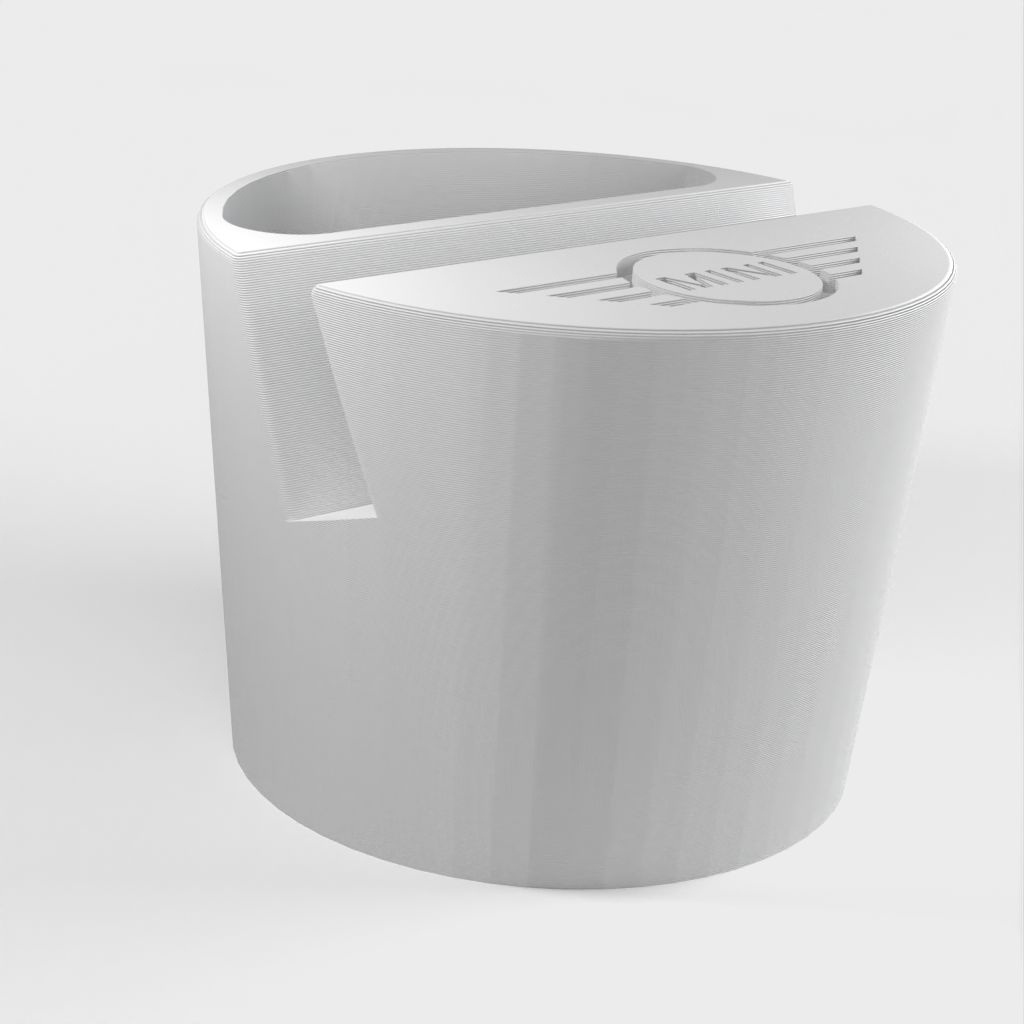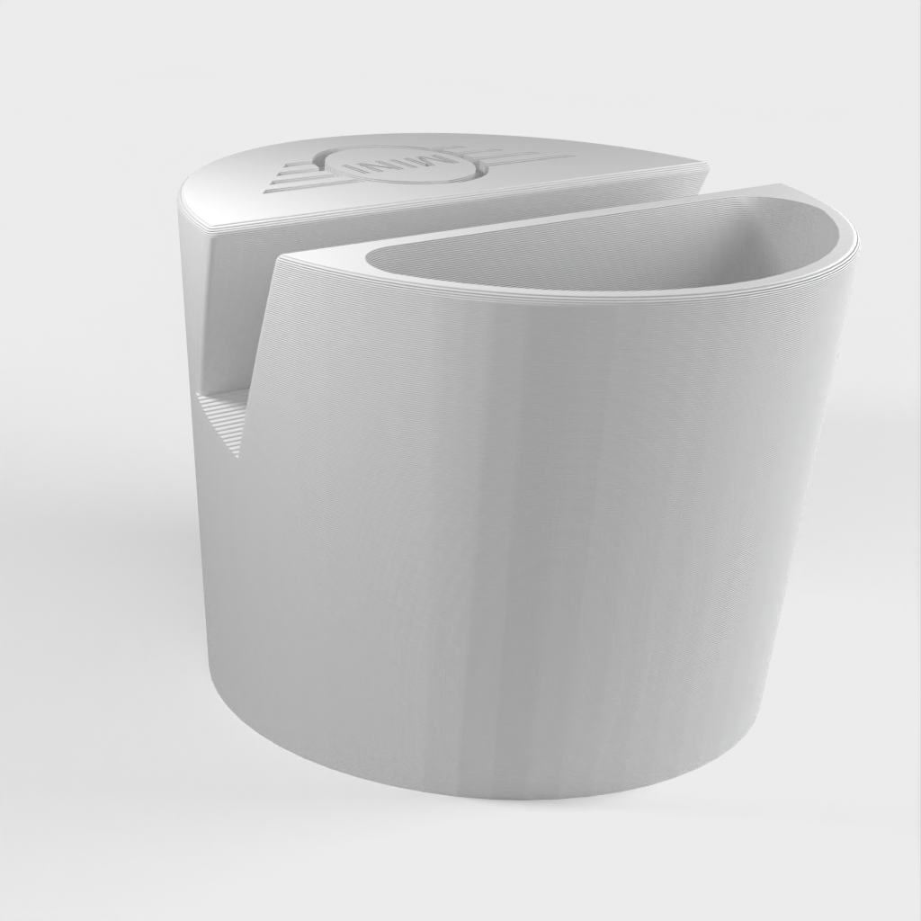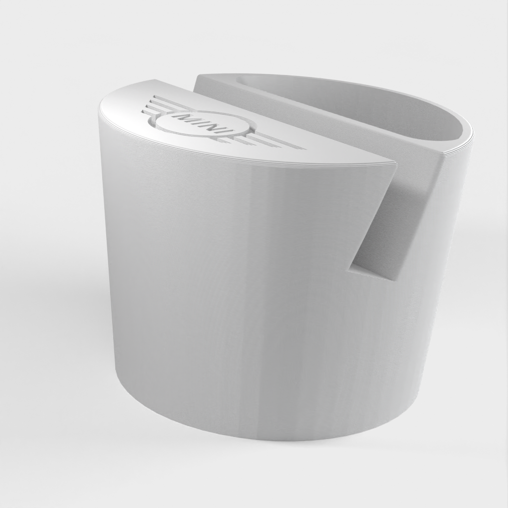 Telefonhalter für einen Mini Cooper, der so konzipiert ist, dass er in den Getränkehalter passt. Der Telefonhalter bietet Platz für Telefone mit einer Dicke von bis zu 11 mm und einer Breite von 75 mm. Mit Mini-Logo und einem Loch für kleine Gegenstände wie Fernbedienungen. Hilft dabei, Ordnung in Ihrem Auto zu halten und stellt sicher, dass Ihr Telefon immer in Reichweite ist.