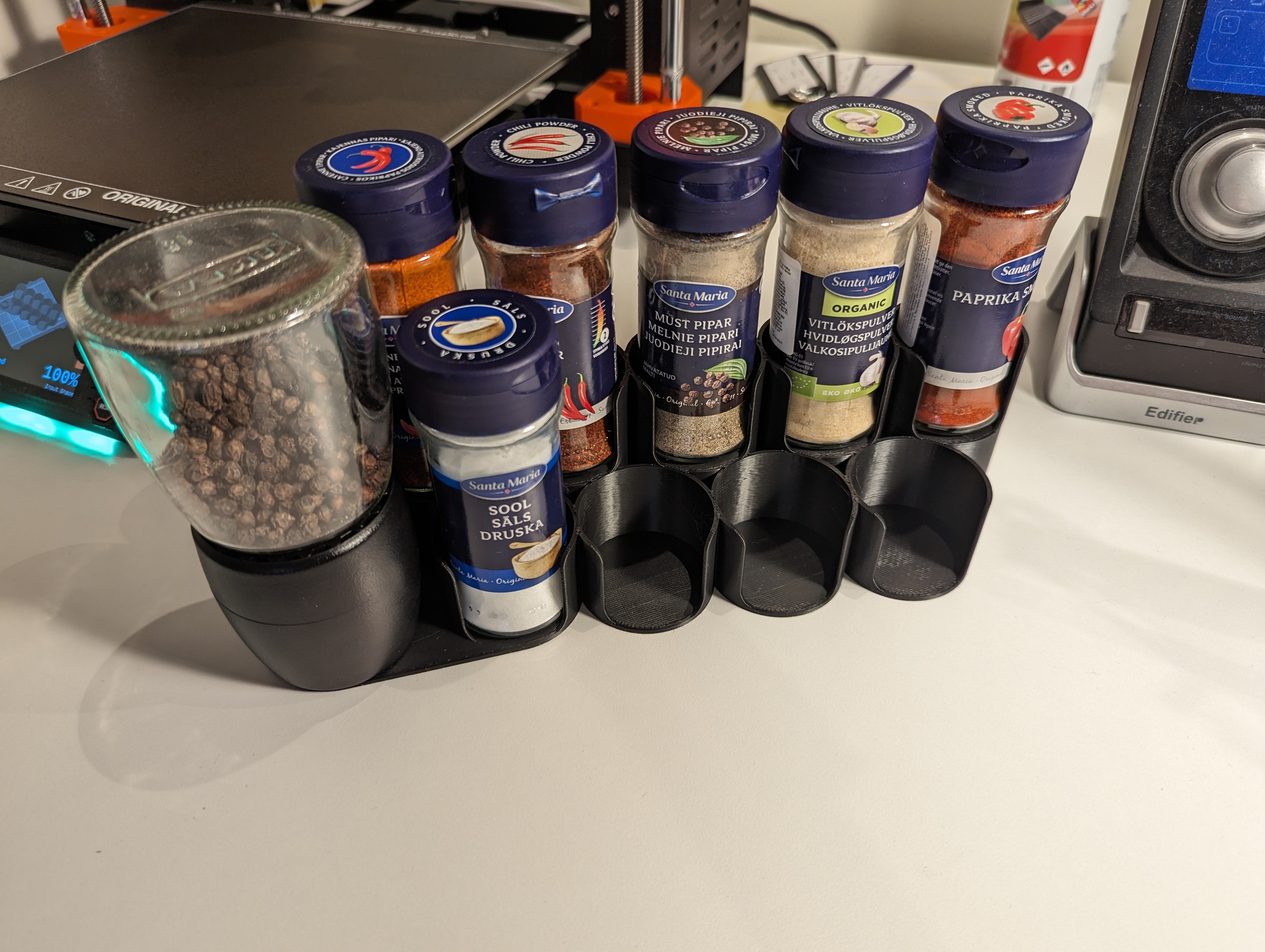 Ein einzelnes Gewürzregal für 9 „Santa Maria“-Gewürzdosen und 1 Ikea IHÄRDIG-Gewürzmühle. Jeder Platz für Gewürzdosen hat einen Innendurchmesser von 42,2 mm. Dies macht das Organisieren und Aufbewahren von Gewürzen einfach und praktisch.