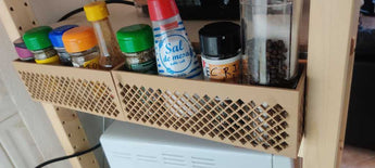 Bringen Sie Ordnung in Ihre Gewürze mit diesem praktischen Gewürzregal, das speziell für IKEAs beliebtes IVAR 50 cm Regalsystem entwickelt wurde. Diese clevere Aufbewahrungslösung ermöglicht Ihnen, Ihre Gewürzgläser effizient zu organisieren, sodass Sie sie beim Kochen immer griffbereit haben. Das Regal ist so konzipiert, dass es perfekt unter ein horizontales Regal passt und so optimale Stabilität und Raumausnutzung gewährleistet. Eine stabile untere Stütze trägt zusätzlich zur Haltbarkeit bei und verleiht Ihrem Gewürzregal zusätzliche Stabilität. Für eine sichere Befestigung werden 5 Holzschrauben für das Regal selbst und 3 weitere Schrauben für die untere Stütze benötigt. Zusätzlich werden die beiden Hauptteile mit einer M3-Schraube miteinander verbunden. Wir empfehlen die Verwendung von M3 x 15 mm Holzschrauben für eine solide Montage. Schaffen Sie mit diesem eleganten Gewürzregal eine übersichtlichere und funktionalere Küche.