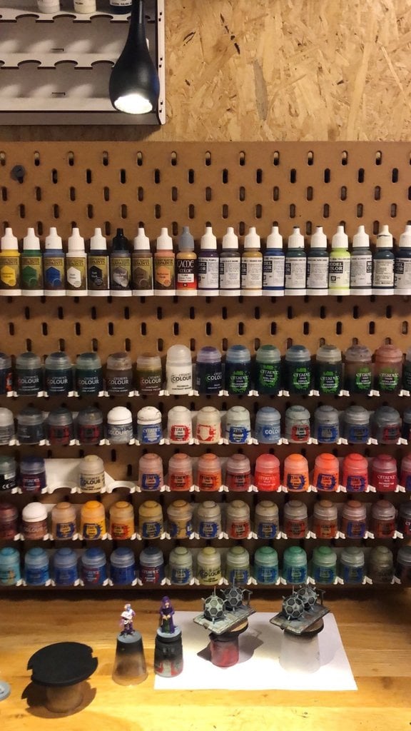 Citadel-Farbständer für IKEA SKÅDIS Stecktafel. Das Produkt bietet Platz für 5 Citadel-Farbflaschen von Games Workshop.