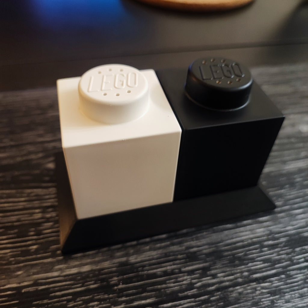 Halter für Lego Salz- und Pfeffermühle. Der Halter ist praktisch und stilvoll und schafft Ordnung auf dem Tisch. Es ist so konzipiert, dass es Standard-Lego-Salz- und Pfeffermühlen aufnehmen kann, wodurch Ihr kulinarisches Erlebnis noch verspielter und farbenfroher wird.