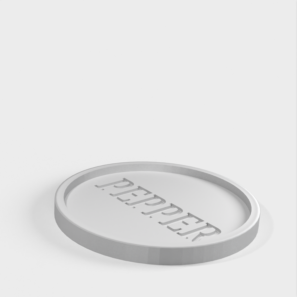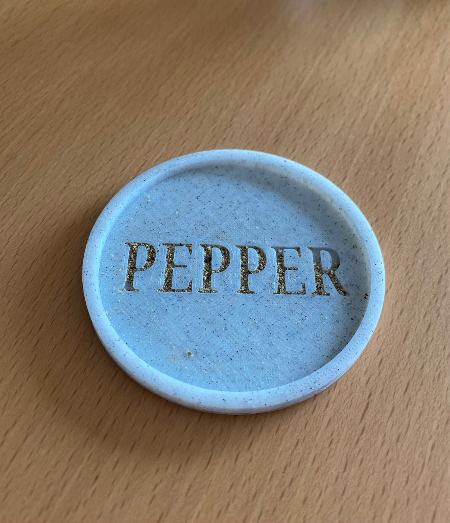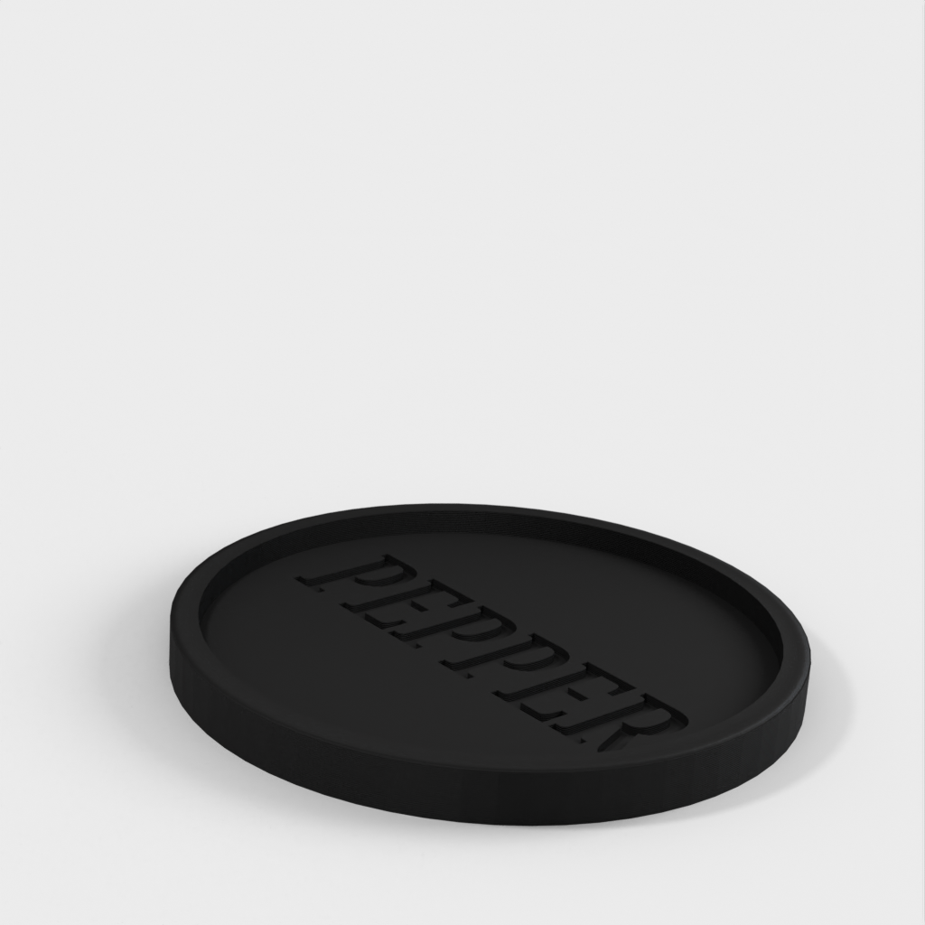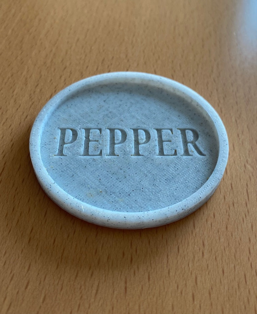 Ein lustiges Detail ist das Wort „Pfeffer“, das als Negativfeld am Boden des Tabletts aufgedruckt ist und mit gemahlenem Pfeffer gefüllt ist. Sobald es vollständig gefüllt ist, sollten Sie darüber nachdenken, eine Schicht aus lebensmittelechtem Harz hinzuzufügen, um den Pfeffer im Wort „Pfeffer“ zu fixieren.