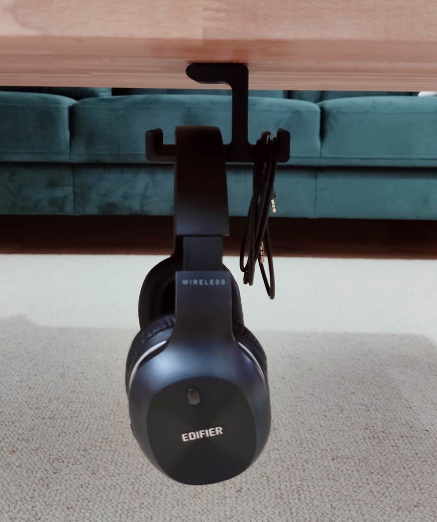 - Har to integrerede kroge: én til opbevaring af hovedtelefoner/headset og én til kabelstyring.