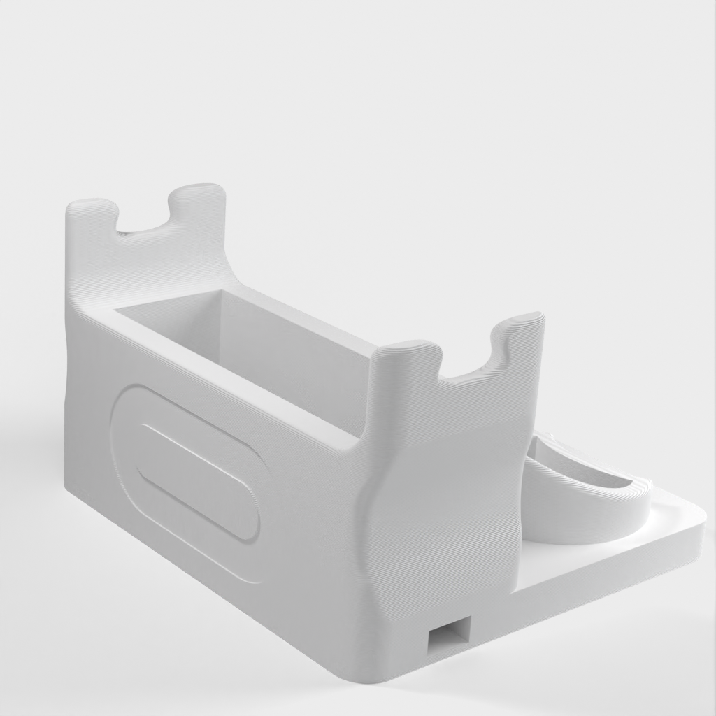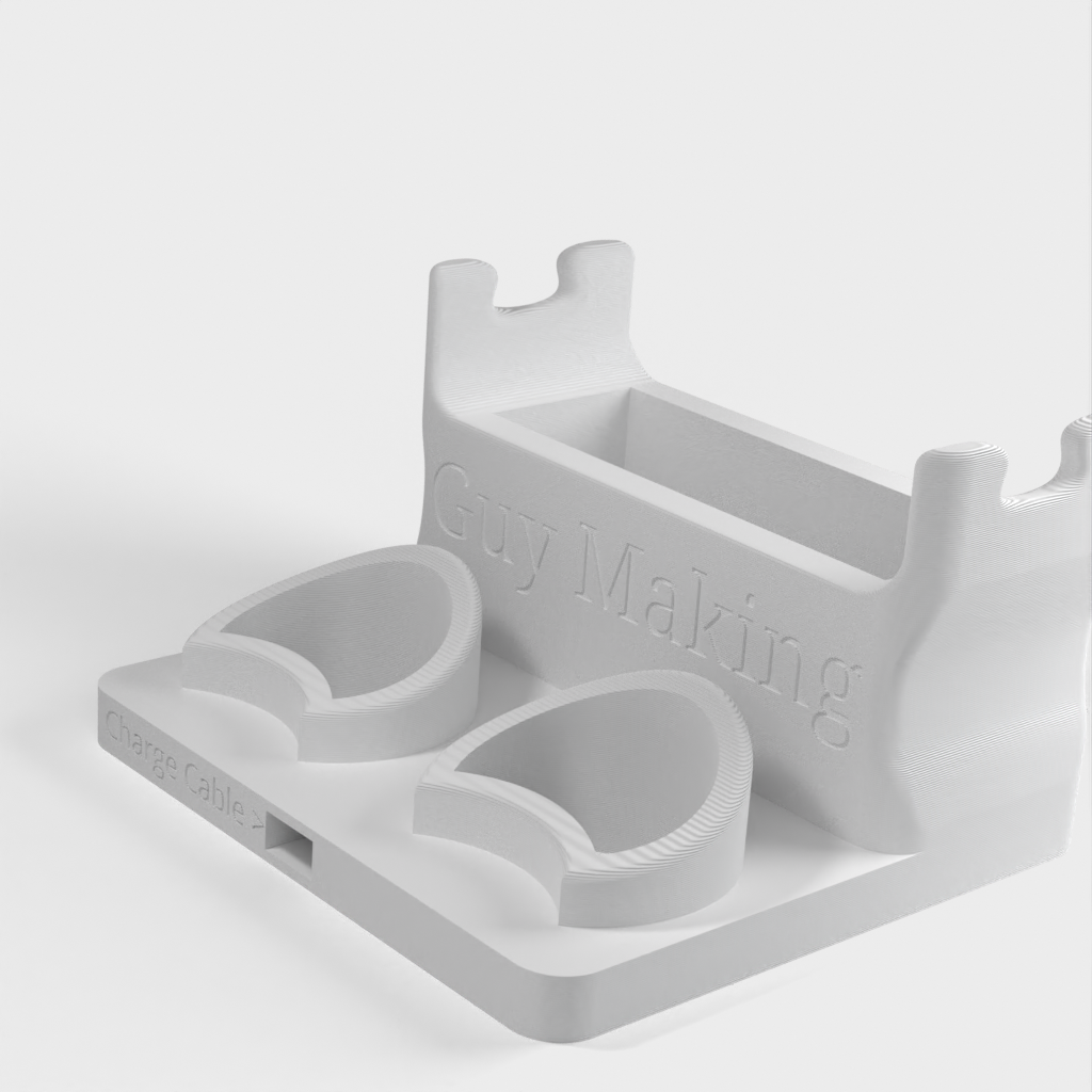 Dies ist ein Ständer für eine Oculus Quest, der sowohl Ihrem Headset als auch Ihren Controllern Platz bietet. Es verfügt über ein Loch für Ihr Ladekabel und eine Öffnung an der Oberseite zur Aufbewahrung verschiedener Zubehörteile.