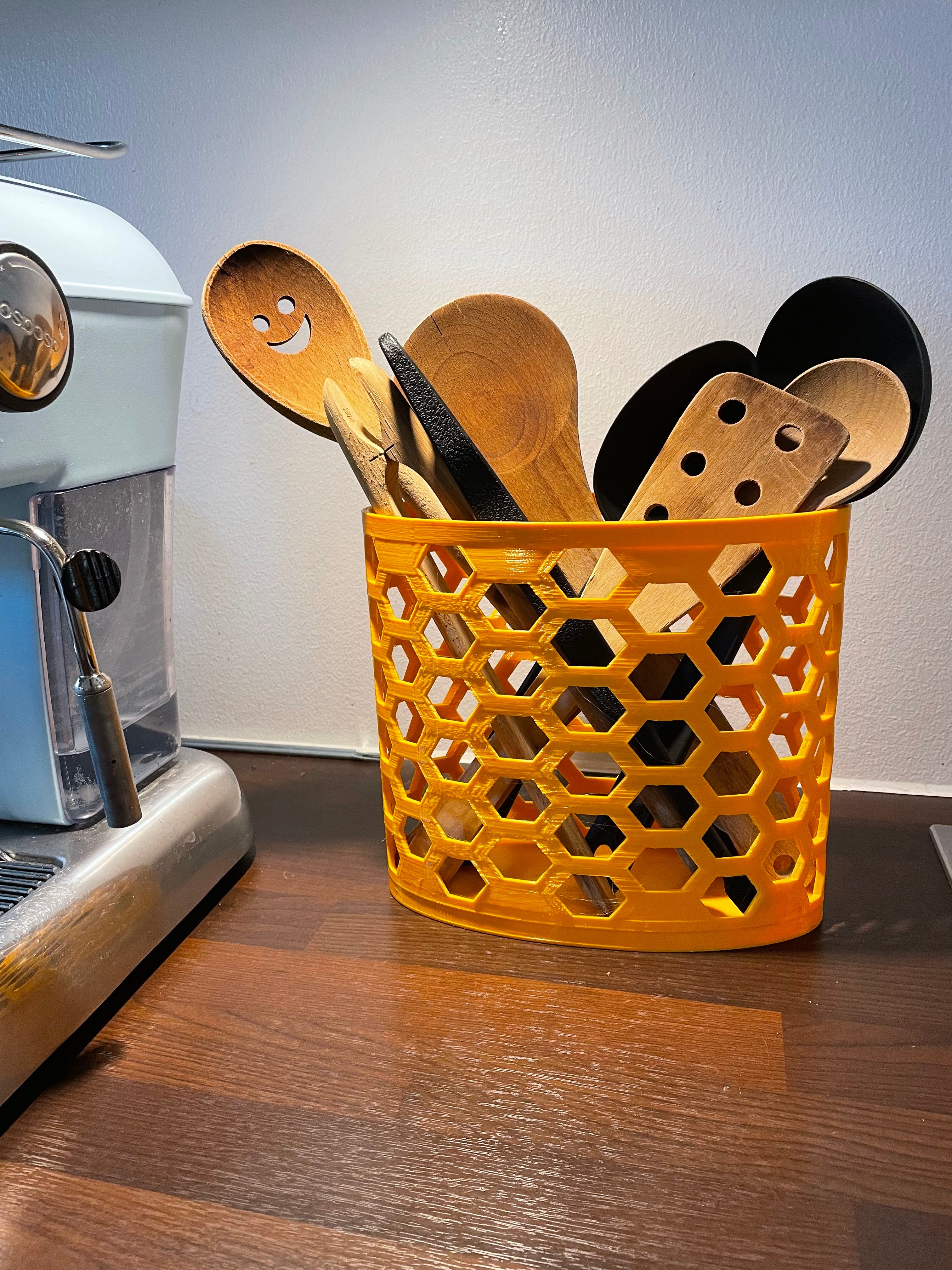 Dies ist ein schlanker Küchenutensilienhalter, der sich perfekt für die Aufbewahrung Ihrer wichtigsten Küchenutensilien eignet. Die kompakte Größe macht es ideal für jede Küche und die melonengelbe Farbe sorgt für einen Farbtupfer. Im Vergleich zu einem Standardmodell ist dieser Werkzeughalter auf der x-Achse 200 % größer und auf der y-Achse 80 % kleiner.