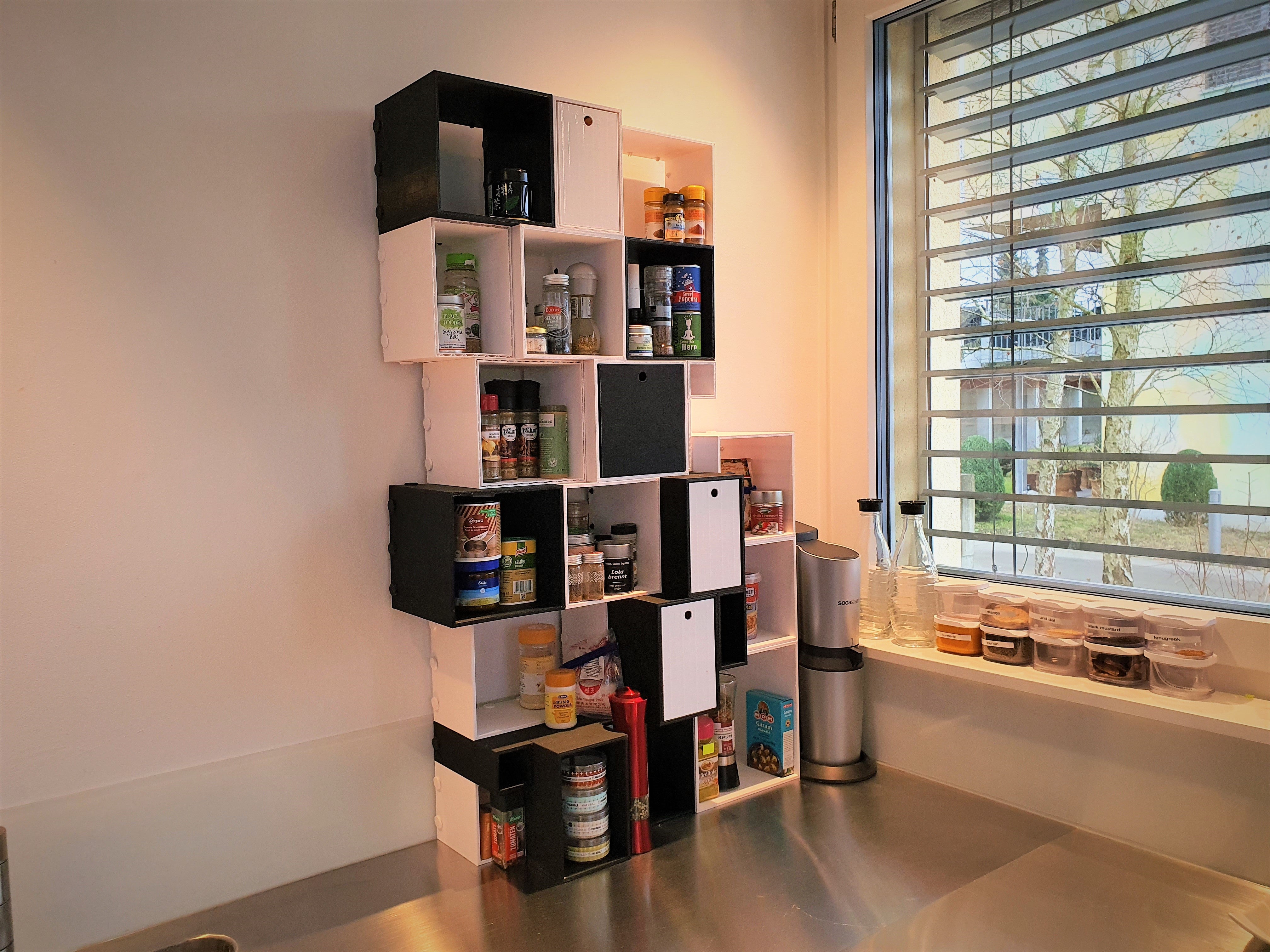 Modulares Gewürzregal, mit dem Sie Ihre Gewürze einfach organisieren können. Passt gut in jede Küche und bietet einfachen Zugriff auf alle Ihre Lieblingsgewürze. Jedes Modul kann einzeln platziert oder mithilfe der mitgelieferten Stifte mit anderen Modulen zusammengesteckt werden. Verwenden Sie die kurzen Stifte, um die Löcher abzudecken, die nicht an anderen Boxen befestigt sind.