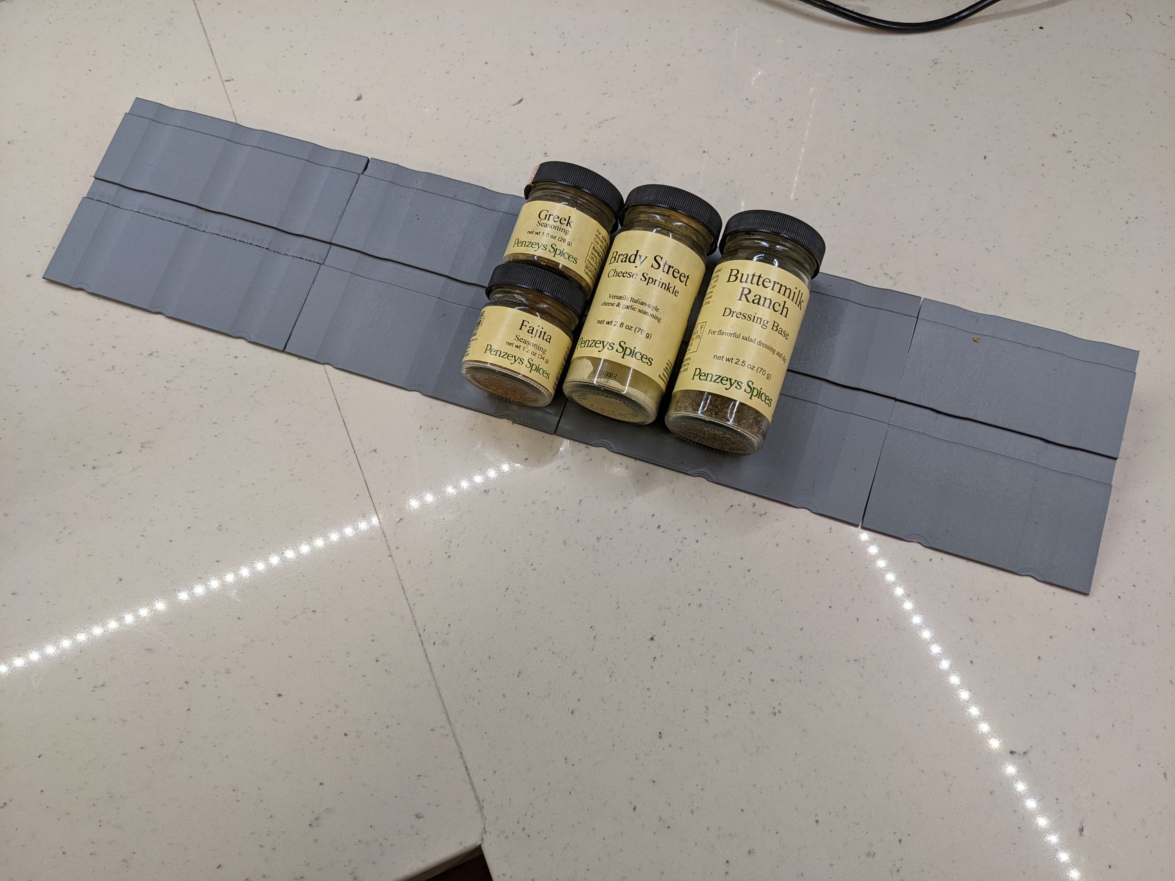Dies ist ein schubladenförmiges Gewürzregal von Penzys, das entweder zwei 1/4 Tasse oder ein 1/2 Tasse Penzys Gewürzgläser aufnehmen kann. Die Unterseite der Teile verfügt über eine DIN-Schiene, die es ermöglicht, mehrere Drucke mit einem stabilen Rahmen zusammenzufügen.