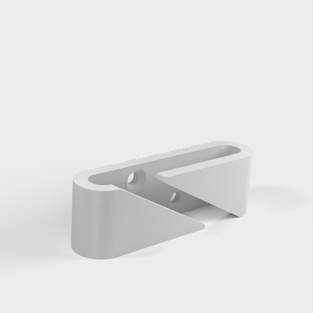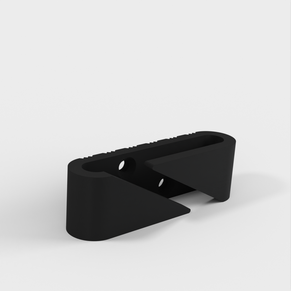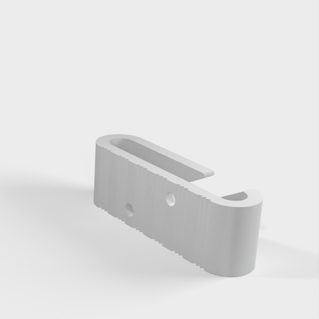 Ein Kabelhalter, der über die Senklöcher mit Schrauben oder aufgrund seiner Rillen auch mit Heißkleber an einer Oberfläche befestigt werden kann.