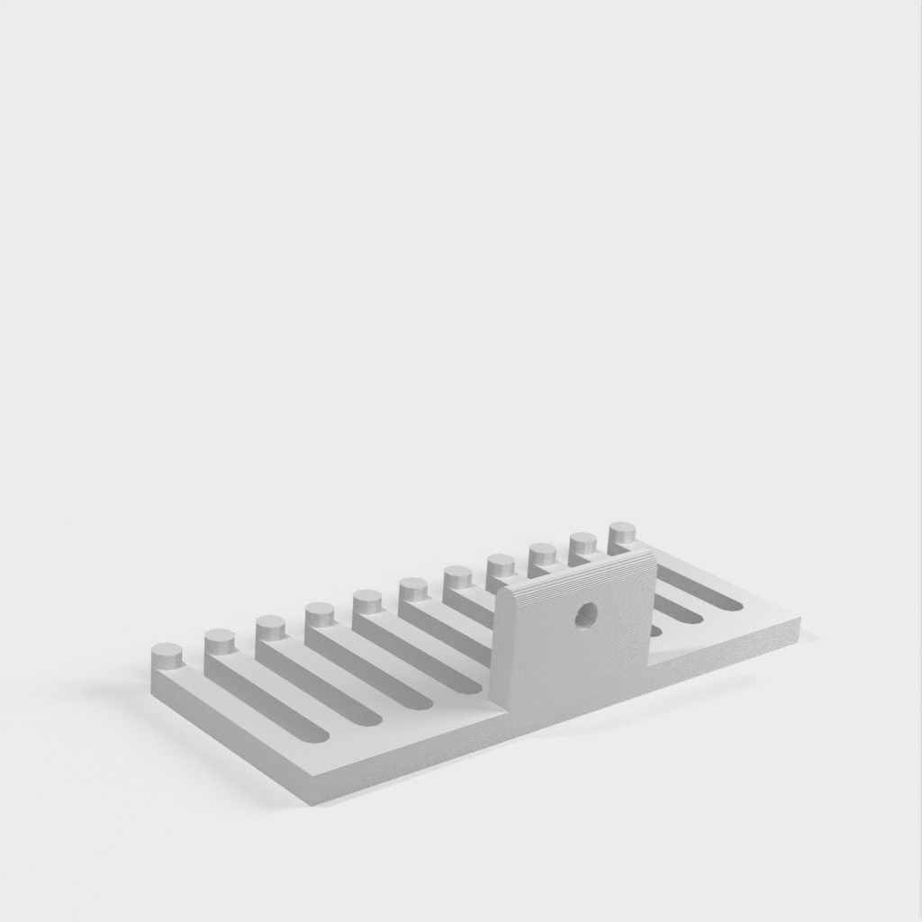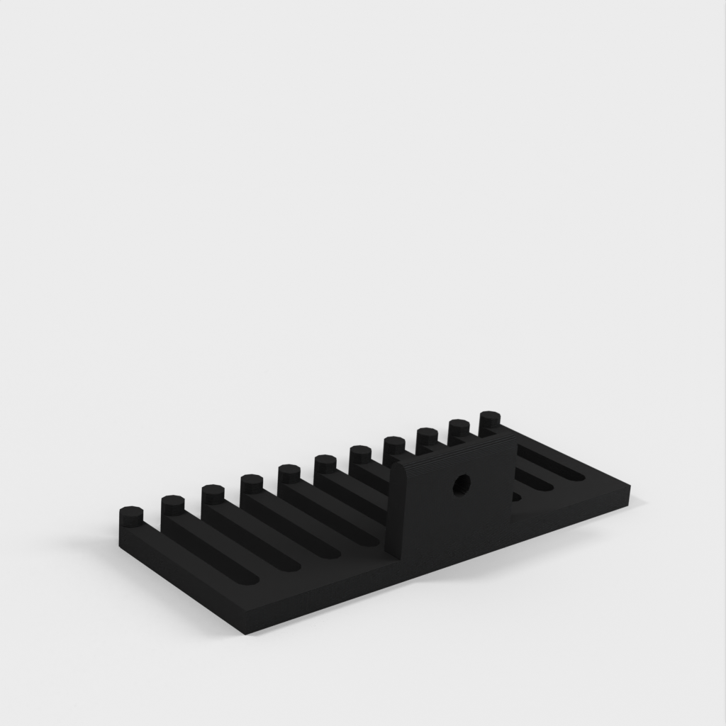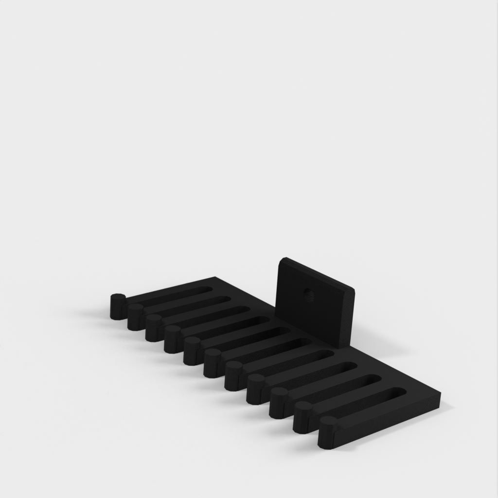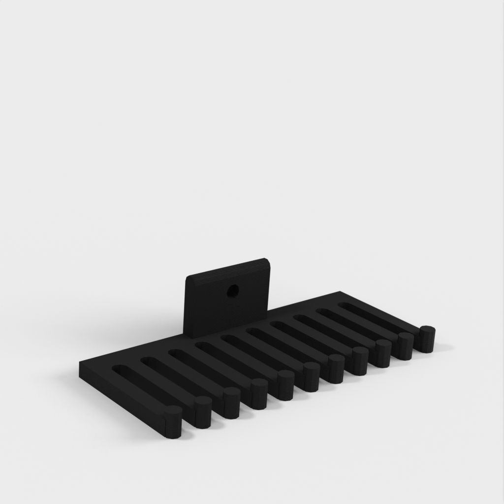 Halter für Kabel, der mit einer Schraube befestigt werden kann. Der Kabelhalter hat die Form eines Kammes, wobei Anzahl der Kammzinken, Höhe, Breite usw. je nach Bedarf angepasst werden können. Viele verschiedene Kabel können problemlos organisiert werden, um eine aufgeräumte Arbeitsfläche zu schaffen.