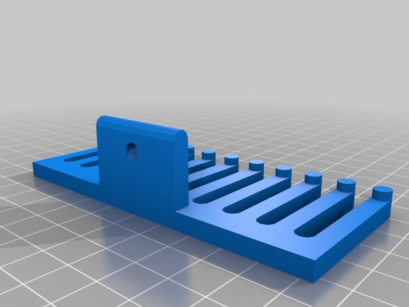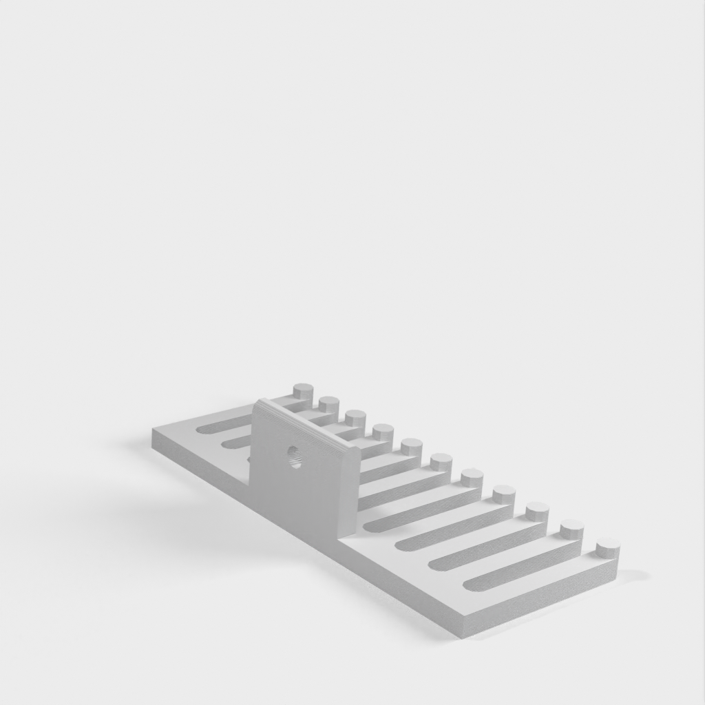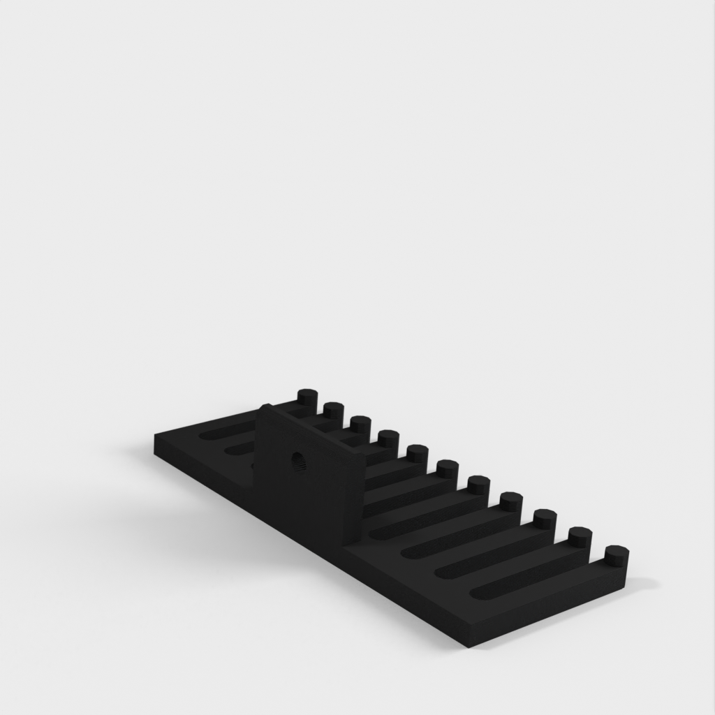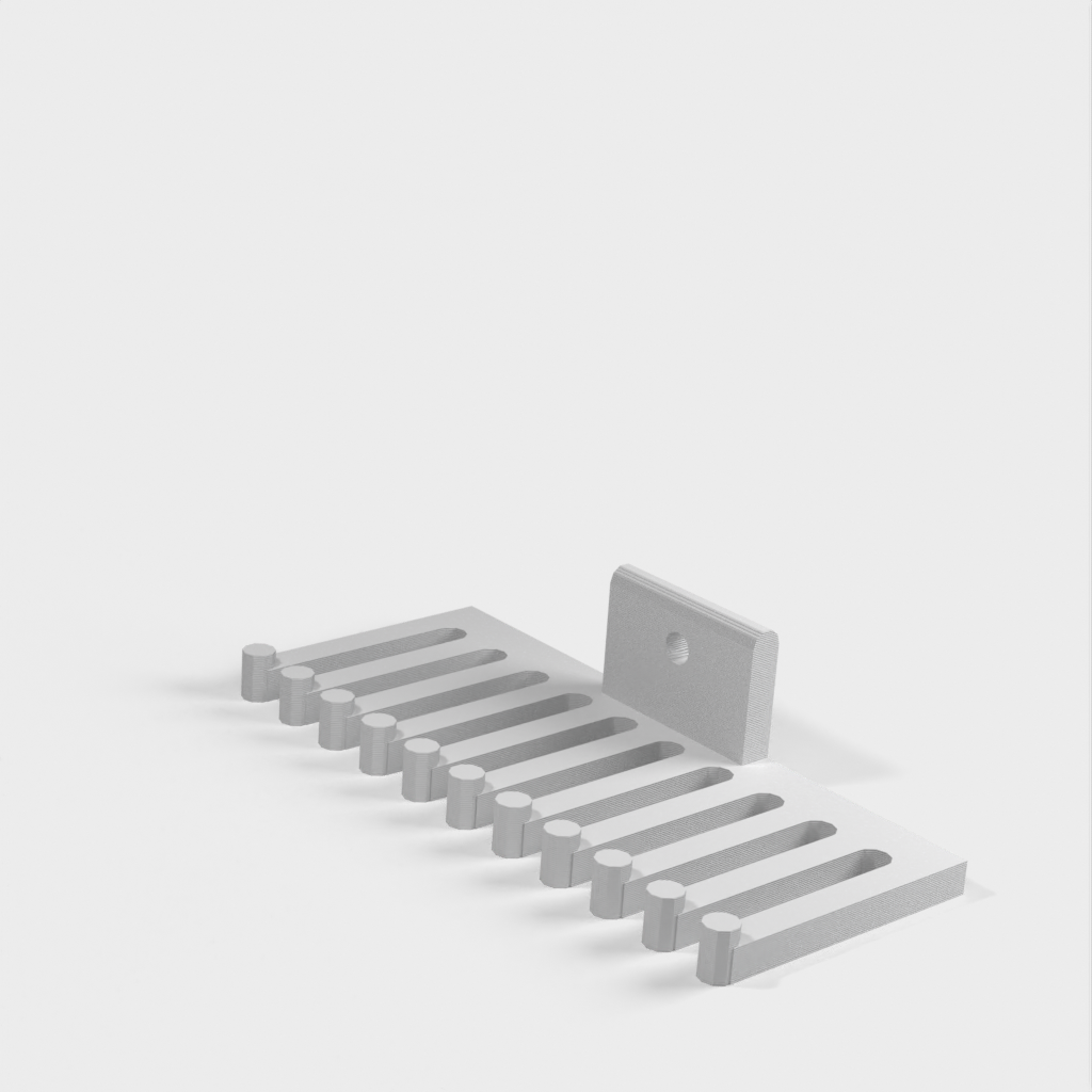Halter für Kabel, der mit einer Schraube befestigt werden kann. Der Kabelhalter hat die Form eines Kammes, wobei Anzahl der Kammzinken, Höhe, Breite usw. je nach Bedarf angepasst werden können. Viele verschiedene Kabel können problemlos organisiert werden, um eine aufgeräumte Arbeitsfläche zu schaffen.