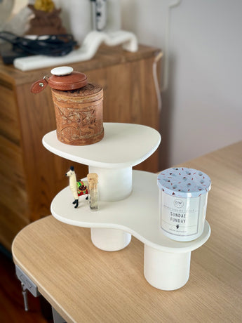 Dieses moderne gewellte Regal ist ideal für Ihr Schreibtisch-Setup oder Ihre Wohnkultur. Verwenden Sie diesen stilvollen Ständer, um Kleinigkeiten zu organisieren oder dekorative Elemente auszustellen. Das einzigartige Design und die drehbare Oberseite schaffen ein modernes und vielseitiges Akzentstück für Ihr Zuhause.