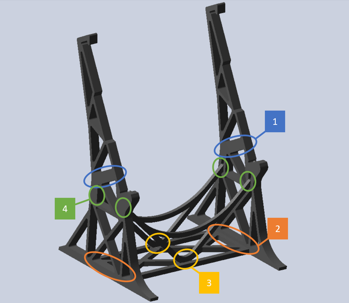 Befestigen Sie die Hakenformen (blaue Kreise) gemäß der Abbildung unten am Falcon und klicken Sie den Ständer mithilfe der kleinen Anschläge an den Ständerstufen (orangefarbener Kreis) unten ein.