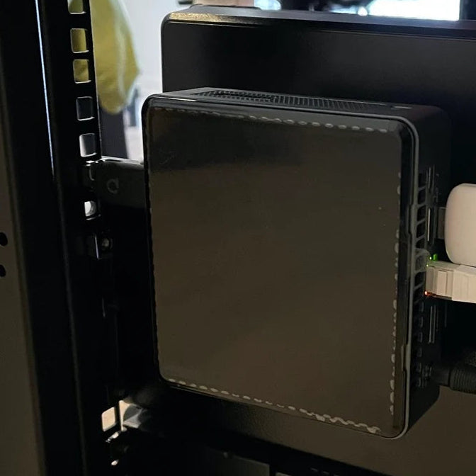 Halterung für die Rackmontage Ihres Intel NUC an der Seite eines Standard-19-Zoll-Racks. Die Rückplatte ist dünn genug, um mit den mitgelieferten Schrauben am NUC montiert zu werden.