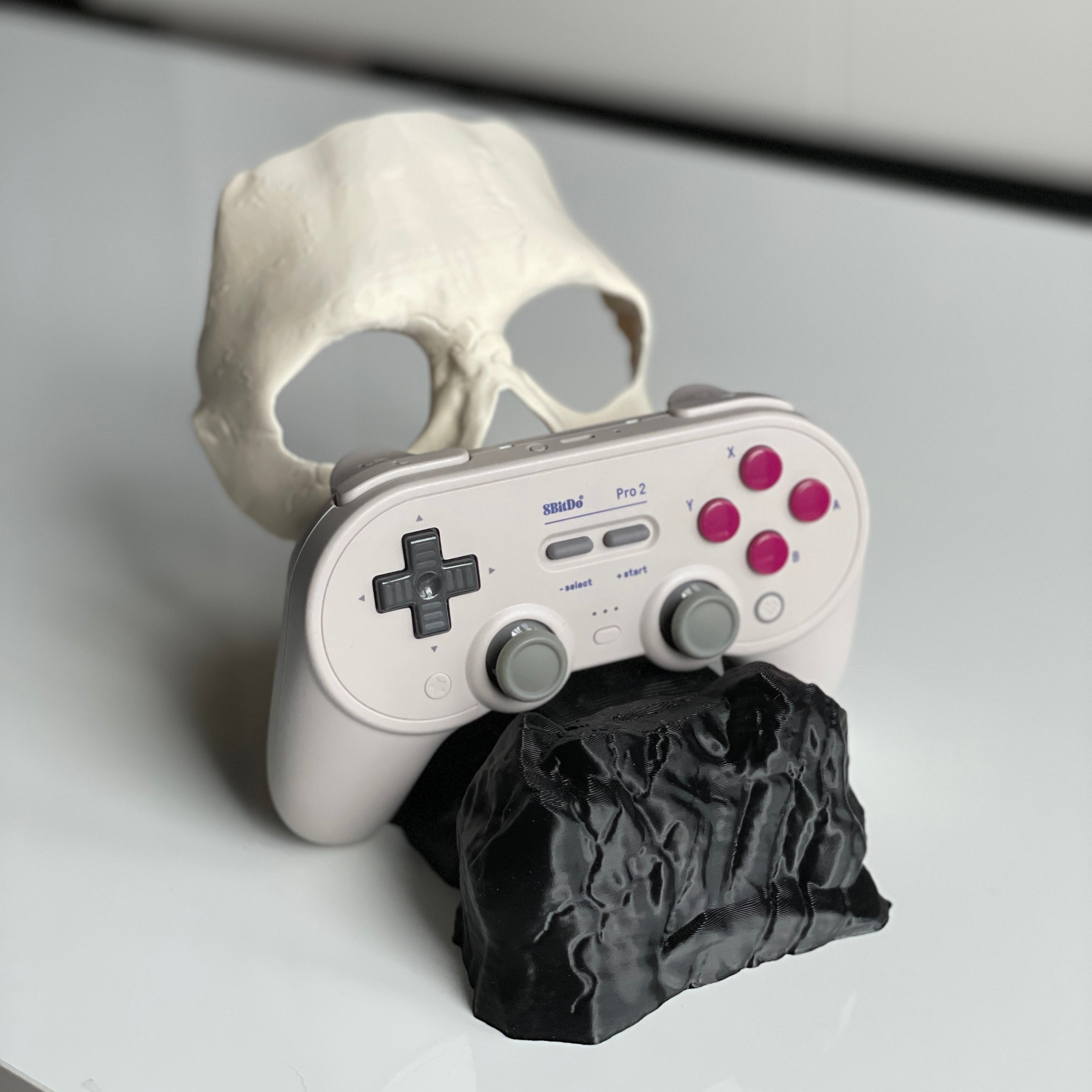 • Der Controller ruht auf einer steinähnlichen Basis und lehnt für einen dramatischen Look an der Ghost-Maske.
