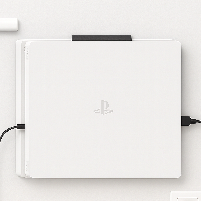 Einfache und kompakte Wandhalterung für eine Playstation 4 Slim Edition.