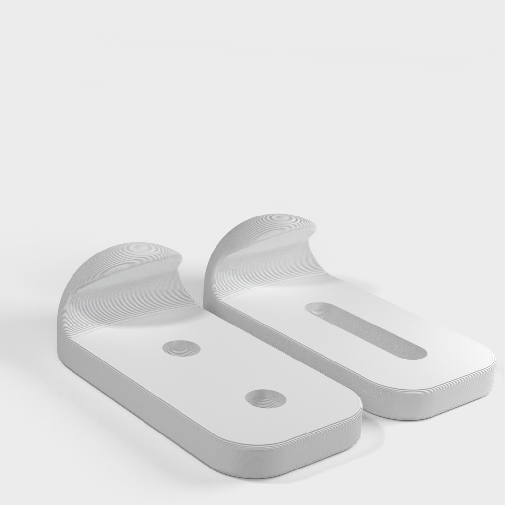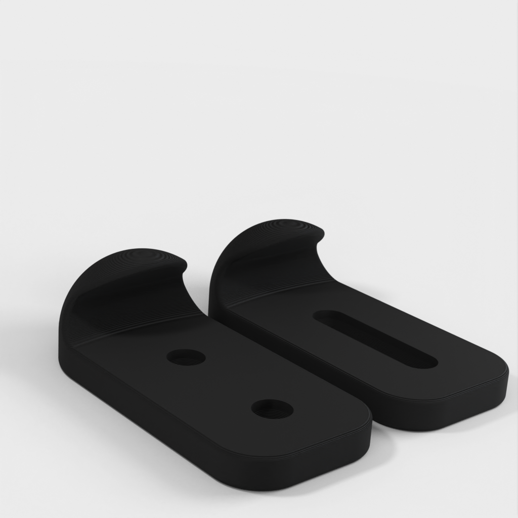 Wandhalterung für ein Skateboard mit breiterem Design und Innenkurven, um die abgerundete Kante eines Skateboards besser zu greifen. Die Befestigungslöcher für die Montage sind kleiner und passen auf 3,5-mm-Senkkopfschrauben, was eine robuste und sichere Befestigung an der Wand gewährleistet.