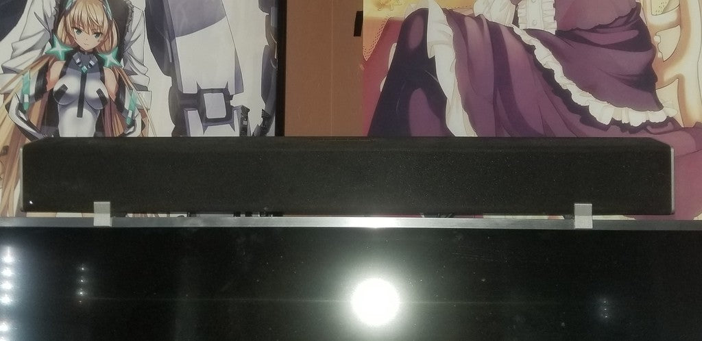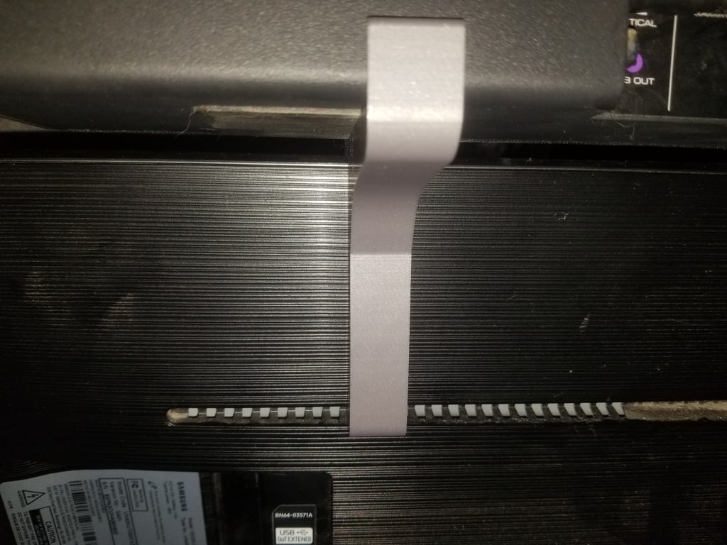 Einfache Wandhalterung für eine Vizio SB2920-C6-Soundbar, die auf einen 40-Zoll-Fernseher der Samsung KU7000-Serie passt. Diese Halterung wird über die Oberseite des Fernsehers geschoben und dann zur Belüftung einfach an der Rückseite des Fernsehers in einem Schlitz befestigt, wodurch ein... saubere und ordentliche Installation.