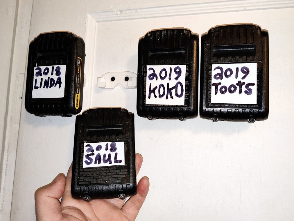 Dies ist eine minimalistische Wandhalterung für Dewalt 20-Volt-Lithium-Ionen-Akkus. Die Montage erfolgt einfach mit zwei 1/2" #8 Senkkopfschrauben an der Wand.