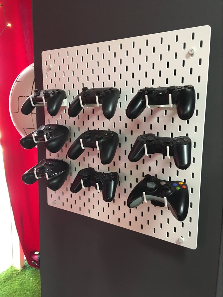 Dies ist ein universeller Controller-Griff, der für IKEA SKÅDIS-Boards geeignet ist. Aufgrund seiner Vielseitigkeit kann es mehrere Arten von Controllern unterstützen, darunter Xbox 360 und One, Playstation Dualshock 3 und 4, Nintendo Pro, Steam, NVidia und SteelSeries Nimbus. Es ist für die einfache Montage auf SKÅDIS-Boards konzipiert und bietet eine intuitive und organisierte Möglichkeit, Ihre Controller aufzubewahren.